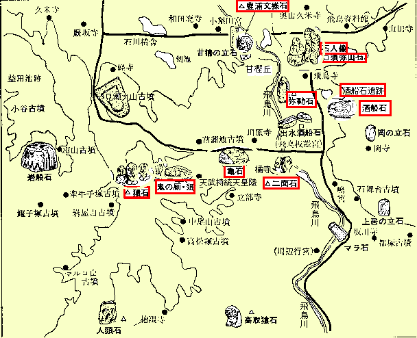 1.猿石7世紀、明日香村平田、高さ、95、90、87、115 飛鳥駅から国道169号線を越し東へ100m位で左折、北西に進むと欽明天皇陵に着く。その左手前の吉備姫王の墓があり、墓石の両側に、猿のような顔をした石が墓を守るように2体ずつ並んでいる。そのうちの3体は裏表の両面に顔を持つ。 江戸時代に欽明天皇陵の南の田から掘り出され、のち現在地に移された。また、吉備姫王墓の東南5kmにある高取城第二城門跡の一体は、ここから運ばれたものと伝えられている。 |