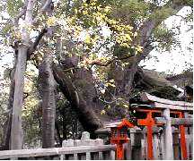 神木「千枝の楠」 葛の葉稲荷神社境内にある。 白狐が身を隠した楠。樹齢、すでに2千余年。楠大明神を祭る。 根元より二つに分かれているので、一名夫婦楠とも言い、枝振りが四方に繁茂しているので、千枝(知恵)の楠とも言い伝えられている。 |