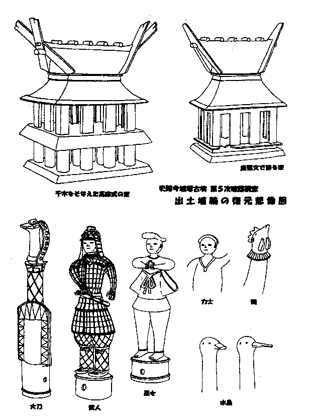 これらは少なくとも、家4、囲い10、器財(蓋2、大刀6・盾1、靱(ゆき)1)、人物(武人2、巫女6、カ士2、椅子に座る人物2)、動物(馬1・犬?4・鶏1・水鳥7)などがあります。そして、基底部か遺存して本来の位置がわかるものだけでも61点以上あります。家形埴輪には円柱を持つ高床式で屋根を千木や鰹木で飾る神殿様の希有な例や、内部に須恵器の杯を据えた珍しい例もあります。囲い形埴輪は南北一列に並び、埴輪群を東西に分断するように区切っていました。人物では玉纏大刀(たままきのたち)を佩いた武人や椅子に座したとみられる人物があります。