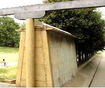 椿井(つばい)大塚山古墳 然し近年復元された「花弁形装飾付鉄製品」が三角縁神獣鏡の神像の冠と似ていることから被葬者が武人より宗教的司祭者ではないかと言い出された。 第1級の遺跡ながら前方部は田畑の造成で削られ、残っているのは後円部のみ。 それも明治27年に国鉄の線路敷設の為、東西に分断されて、形状が崩れてしまった。 石室の天井板は山城中学校の校庭に運ばれ保存されている。↓ ![]() |