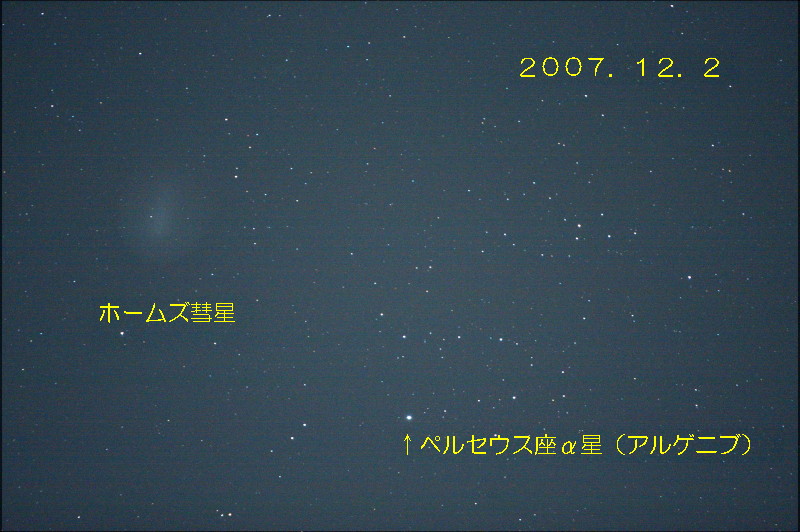 | 「ホームズ彗星」 急に増光し2等級の明るさになった彗星です、11月2日に肉眼で見ることが出来ました。 普通のレンズ(標準と望遠)をつけたカメラを三脚に固定しレリーズでえいや! ピントと位置決めだけ合わし、後はカメラ任せ・・ 今まで抱いていた彗星のイメージ(ほうきの様な)とは程遠い まん丸の彗星です。望遠で撮った彗星には後ろに恒星が写っています。 国立天文台でホームズ彗星の緊急キャンペーンがあります。 URLは http://www.nao.ac.jp/phenomena/20071102/live.html |