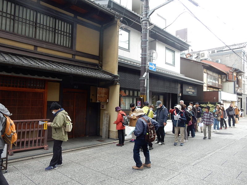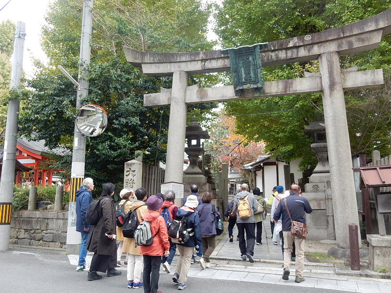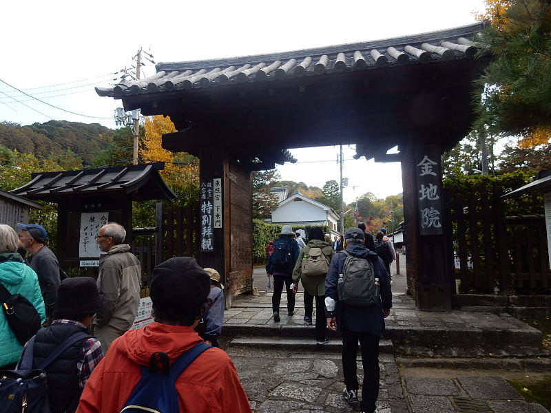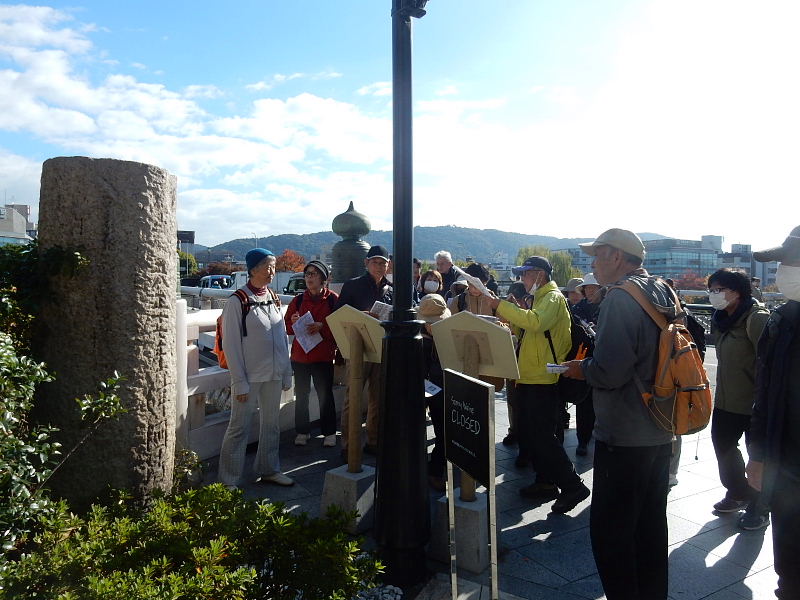 本日案内していただく森岡さん(古文化同好会)より、本日の行程及び注意事項について、京の町は紅葉が始まりどこも混雑しています、信号を渡るときは無理をしないで余裕を持って渡るよう、全員が渡るのを確認してから出発します。等の説明があり出発です。 |