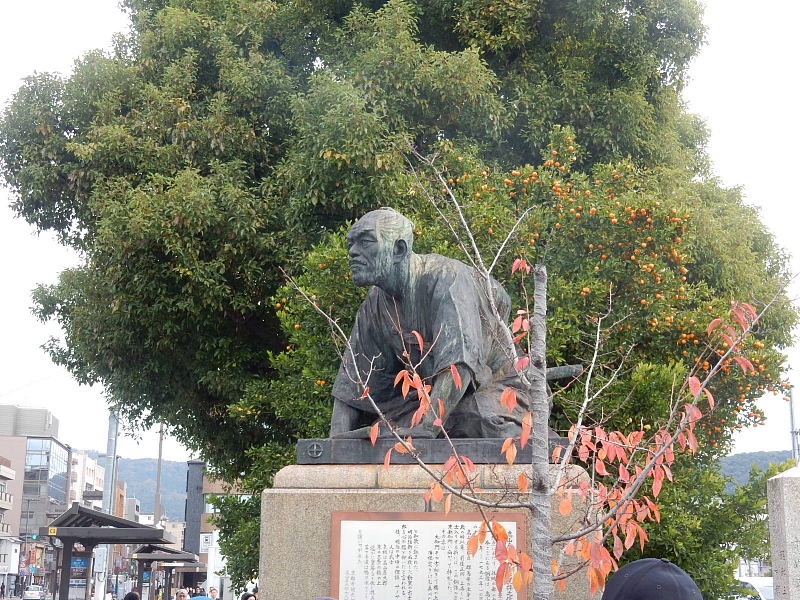 | 御所の方角を向き、御所におわす天皇に向かって望拝する姿の像ですが、武士が土下座をしているような姿から、通称「上下座」として知られており待ち合わせ場所としてよくつかわれているようです。彦九郎は、明和元年(1764)18歳の時、学舎を志し遺書を残して家出し、はるばる京都にやつて来たそうです。 |