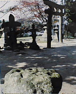 寺の住吉神社のくぼみ石 昔の子供たちが石で 草もちをついてあそんだ |
