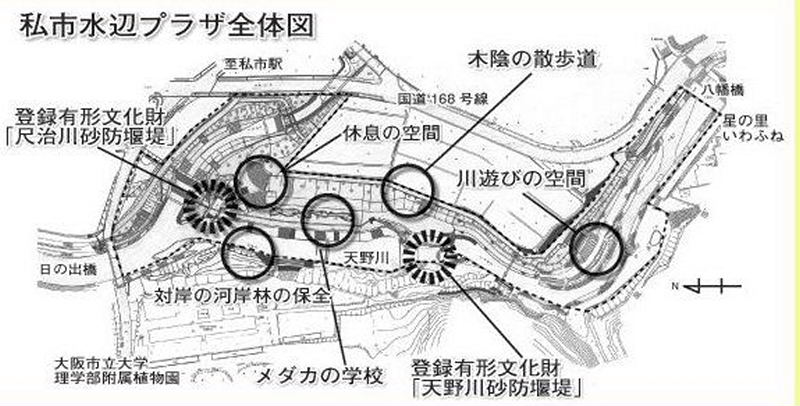 | 平成8年計画策定 19年完成 一級河川天野川の当区間(日の出橋から八幡橋)約430mには、豊かな自然環境が残され、多種の動植物が生息しています。 また、大阪市立大学理学部植物園や交野市立スポーツレクリェーションセンター、府民の森・ほしだ園地のほか歴史的価値の高い砂防えん堤など、訪れた人々にやすらぎを与えてくれる施設や歴史的価値のある施設が川に沿って数多くあります。 天野川水辺プラザ整備事業はこうした自然環境を保全するとともに、川沿いにある交流拠点と連携し、地域交流の拠点にふさわしい水辺空間を創造する。 |