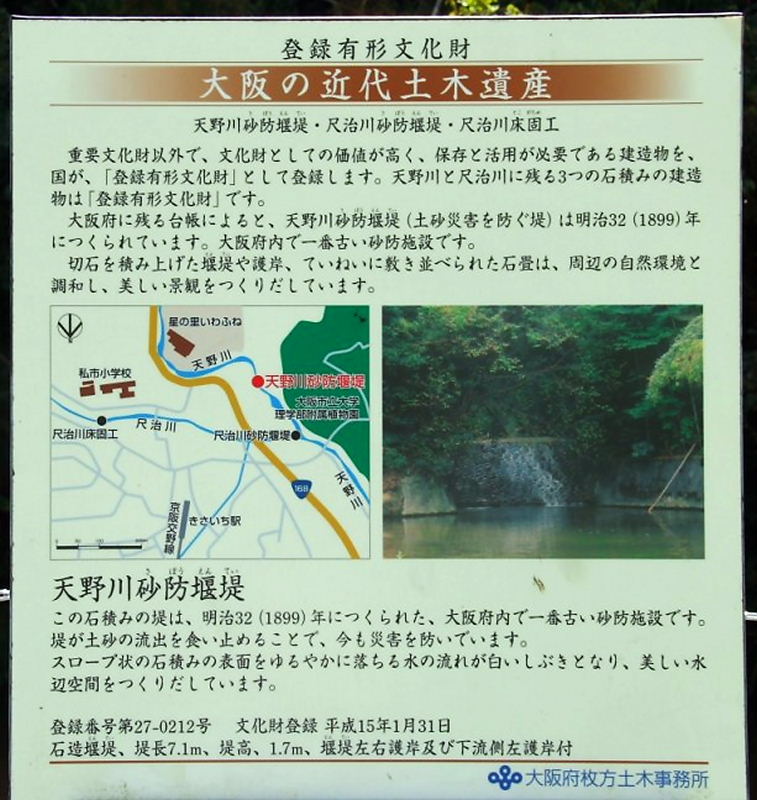| 国登録有形文化財 (明治時代)@天野川堰堤 1基(石造堰堤、 堤長20m、高さ6m) A尺治川堰堤 1基(石造堰堤、 堤長9.3m、高さ2.2m) B尺治川床固工 1基(石造堰堤、 堤長9m、高さ1.8m) ※オランダ人技師デ・レーケの指導により砂防堰堤が築造された。 |