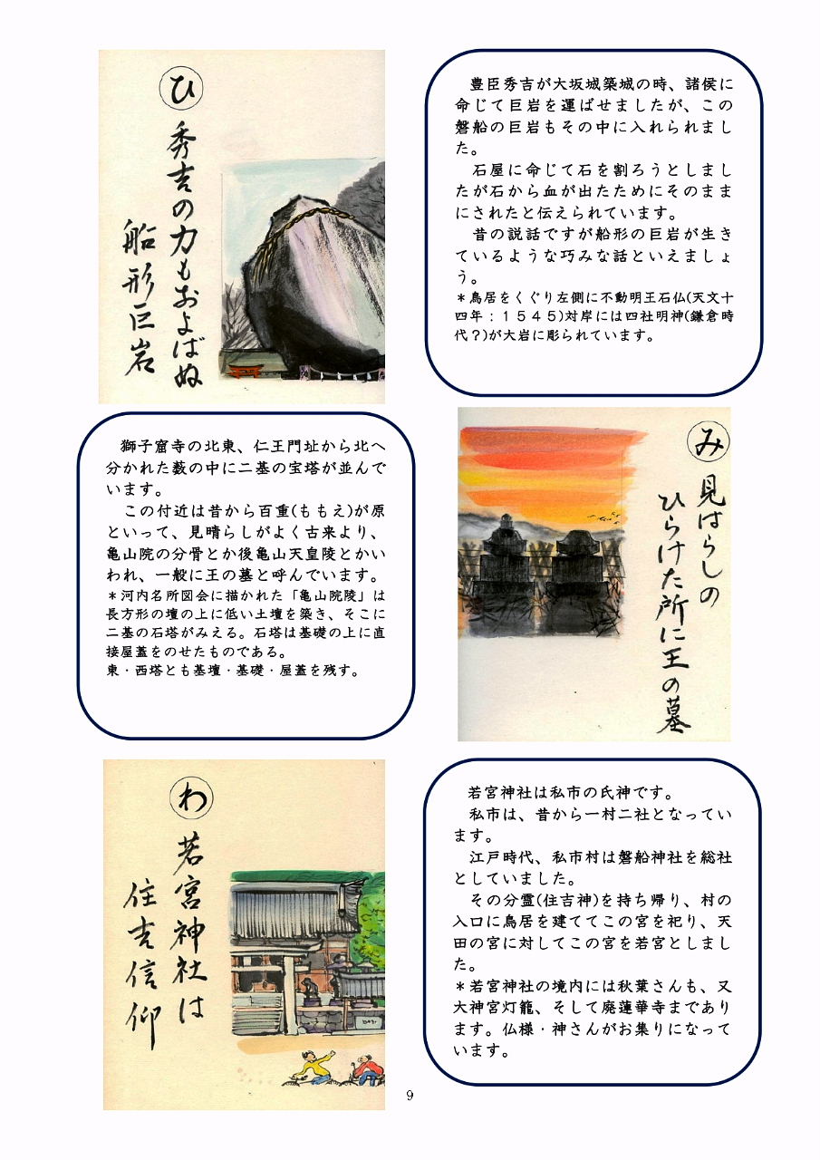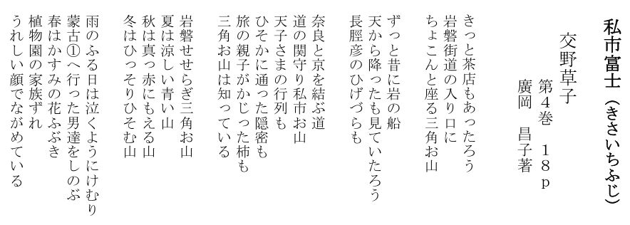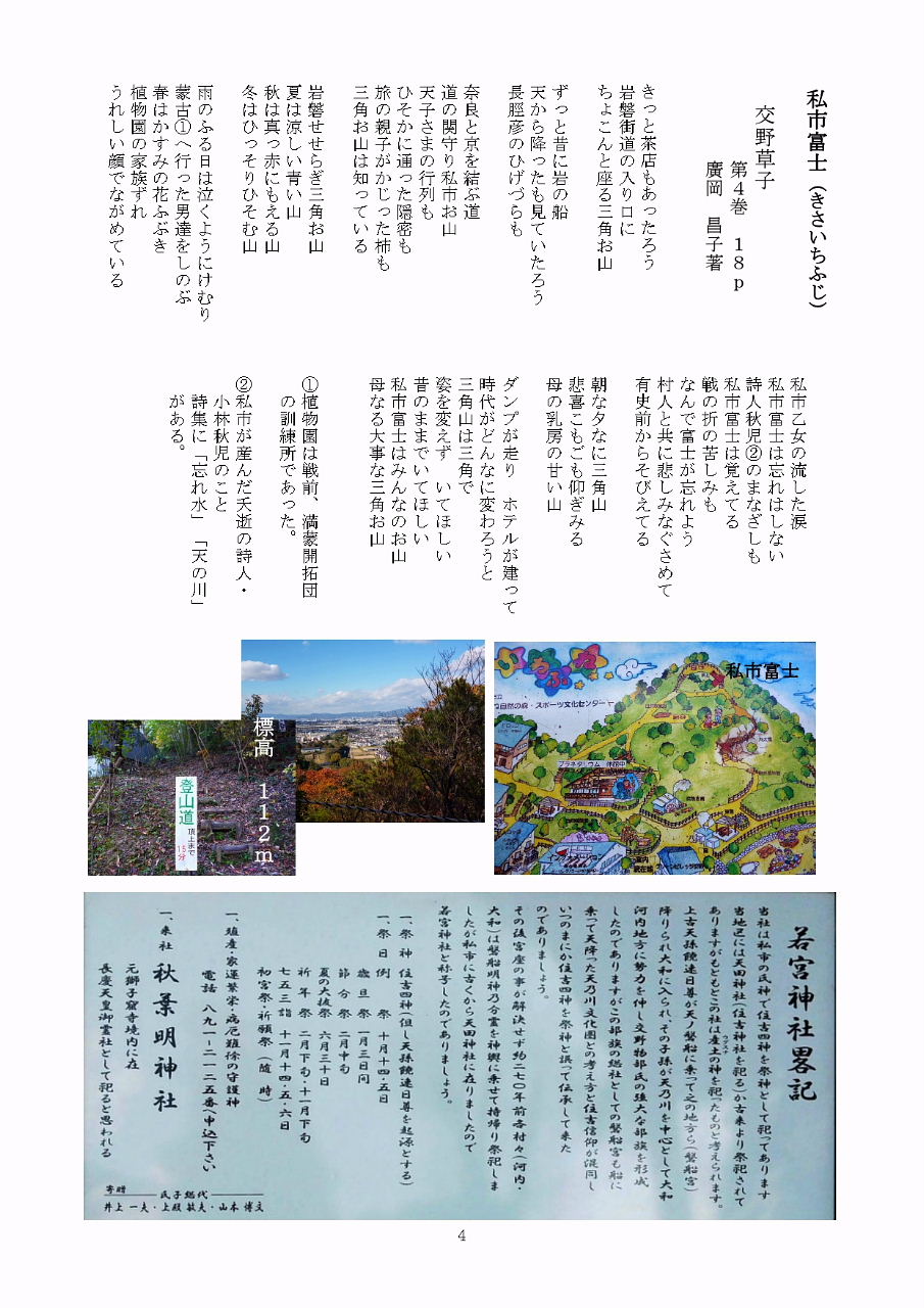 | 地元の人でも、あまり知られていない三角お山。廣岡昌子様 著「交野草子」4巻18pを紹介。 私市富士への登り口は、「星の里いわふね」のプラネタリウムへの道の上り口にあります。 |