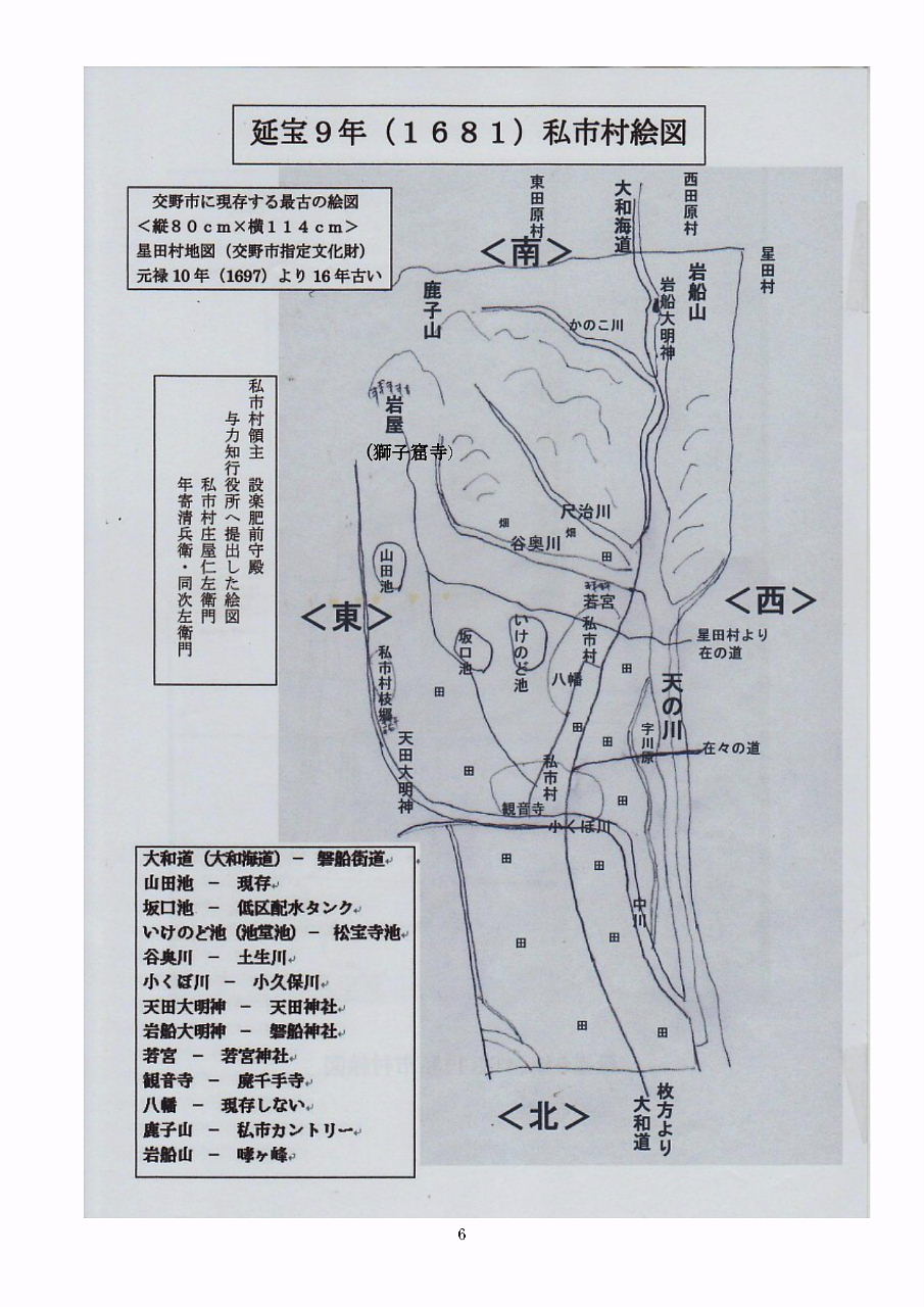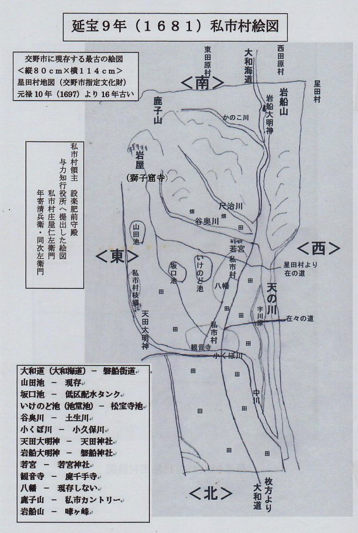 | この延宝9年(1861)の「河州交野郡私市村絵図」は、交野市に現存する最も古い絵図で、交野市指定文化財とされた元禄10年(1697)の「星田村絵図」より16年も古い絵図で、希少価値のある文化財です。 この絵図の裏書によれば、私市村庄屋仁左衛門・年寄清兵衛・同次左衛門ら村役人が、領主の仰せ付けにより提出した絵図の控えであろう。 ※ここに掲載しているのは、本物の絵図ではわかりにくいので、手書で図示したものです。 図示の左下に、描かれた当時の名称を現在に読み直していますので、参考にしてください。 |