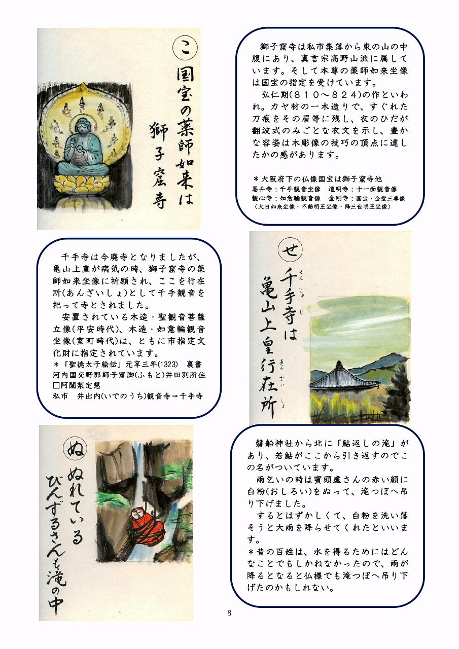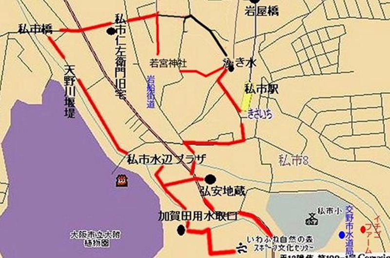 私市駅から土生川を渡り、だらだら道を下ると、右手に今も綺麗な水が湧き出している、ちんちん水の辻に出る。交野では、よく澄みきった水質の良い水のことをちんちん水と呼んで、昔から飲料水として使われてきた。交野の自慢は水だと言われている。 交野の水源は、他市のようなダムや河川の水を、人工的に急速に浄化したものではなく、汚れのない緑濃い木々と花崗岩質の砂れきの山で、自然の巧妙な営みにより、たっぷりと貯水され、じっくりと濾過されたもので、神からの贈り物と思われる清浄なちんちん水だからです。ちんちん水は、「沈沈」に通じ、神秘的な清らかな水を沈沈水(ちんちん水)と言われるようになった。 |