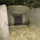 ![]() | 石宝殿(いしのほうでん)古墳(国指定史跡)は、飛鳥の鬼の俎(まないた)・雪隠(せっちん)古墳と同じ構造の非常に珍しい墓室をもつ7世紀の古墳です。 寝屋川市東端の打上(うちあげ)の集落の中を通って裏山へ続く道の終点は高良神社ですが、この神社の東側の細い山道を100mほど進んだ所にある巨石が、石宝殿古墳です。 石宝殿古墳は生駒山地からのびる丘陵に築かれた古墳です。 巨大な花崗閃緑岩(かこうせんりょくがん)という硬い石をくり抜いて「石槨(せっかく)」と呼ばれる死者を葬る部分が造られています。石槨は、上面を平坦に加工した底石(下石)の上に直径3m、高さ1.5mの内部をくり抜いた蓋石を重ねたものです。 内部は幅1m、高さ0.6m、奥行き2.3mで南側に入口があります。入口部分には左側の上下に丸い凹みがあり、本来は扉のようなものがあったと考えられます。この石槨の前には1.5mの間隔で板石が立てられており羨道(せんどう)と呼ばれる通路部分を造っています。 同様な形をした横口式石槨は、奈良県斑鳩町の御坊山3号墳、明日香村の鬼の俎(まないた)・雪隠(せっちん)(厠(かわや))が知られているだけで、きわめて珍しい構造をもっています。 石宝殿古墳の築かれた7世紀には、奈良県の飛鳥地域および「近つ飛鳥」と呼ばれる大阪府羽曳野市・太子町・河南町に集中して天皇・皇族やその側近が葬られていると考えられる古墳が築かれており、近畿地方の他の地域では古墳の築造はほとんど行われなくなります。この時期に北河内地域で唯一築かれた石宝殿古墳は、古墳の形や埋葬施設からも、かなりの有力者が葬られていたと考えられます |