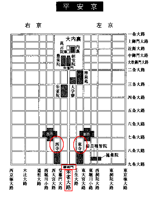 | 地上から消えた平安京 平安京は当時の最新技術を持って作り上げられた理想都市であった。 モデルにしたのは唐の国都、長安。規模は東西が約4.5km、南北が5.2kmであった。 平安京の表玄関は都の南側、九条大路に面して建つ羅城門である。間口七間、奥行き二間あり、屋根は瓦で葺かれ、朱色の柱、白い壁で構成された威風堂々とした二重楼閣であった。二階の部分には都を外的から守る神、兜跋毘沙門像が安置され、侵入者に睨みをきかせていた。 ![]() 堀に架けられた唐橋を渡って羅城門をくぐると、道幅84mの大通りが真っ直ぐ北へ伸び、その先に優美な大内裏の正門、朱雀門を遥か彼方にみることができた。 これが平安京のメインストリート、朱雀大路である。朱雀門に至る約3.8kmの大通りの左右は築地が築かれ、街の喧騒を遮断していた。路傍には柳の木が等間隔に植えられ、新緑の頃ともなれば、やわらかな風にゆらゆらと枝葉をゆだねていた。 この堂々たる羅城門をはさんで、ちょうど両翼を広げたように建てられたのが平安京の二大寺院、東寺と西寺だった。 両寺は左右対称の伽藍配置をとり、東西約250m、南北約550mの広大な敷地に、金堂、講堂、食堂、五重塔、そしていくつもの諸堂が建ち並んでいた。 平安京には、この二寺しか存在しない。 以来、1200年余りの時を経た今日、平安京の偉容なる姿を偲ばせるものはない。 (東寺の謎 三浦俊良氏著を参照) |