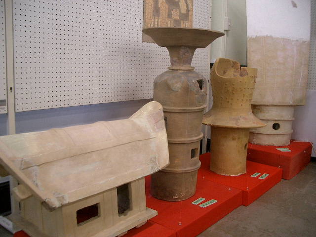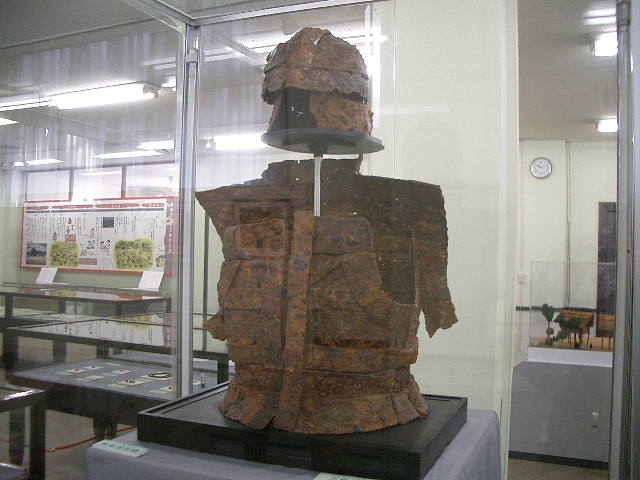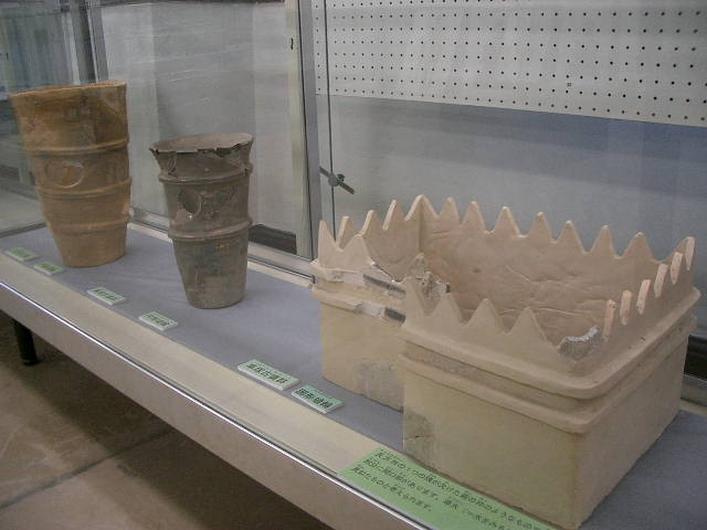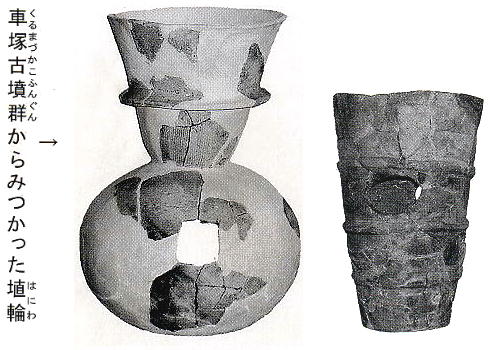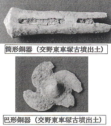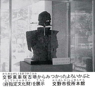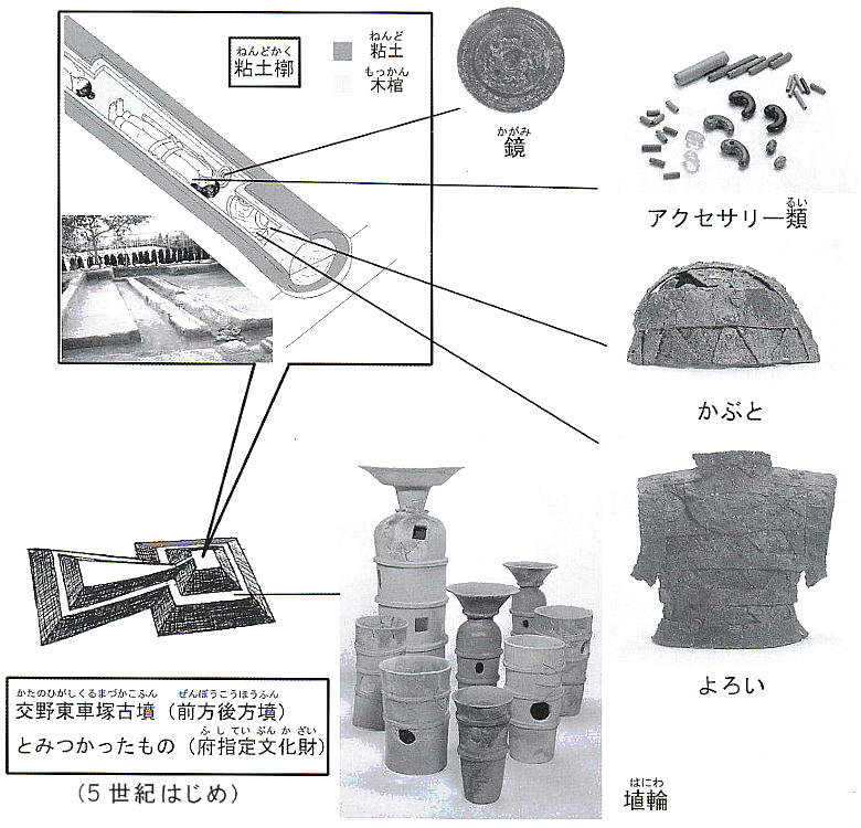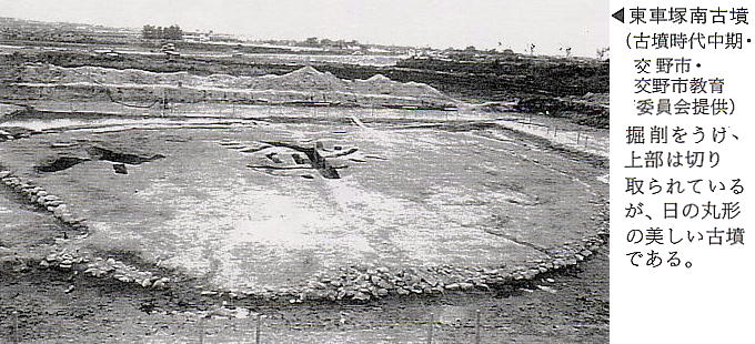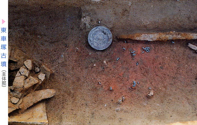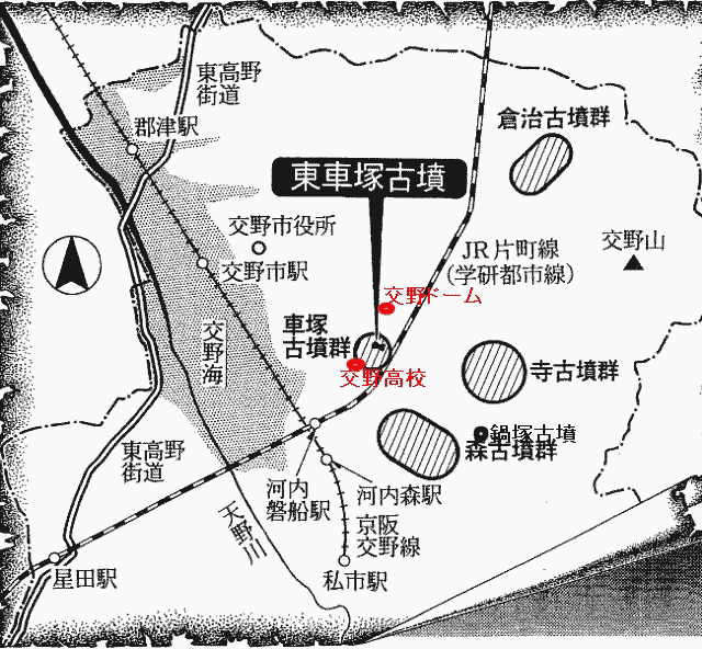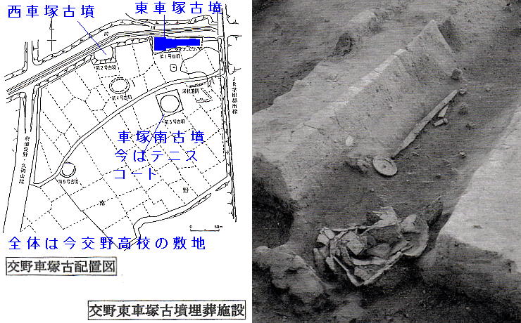 ![]() 北河内の古墳編年表 JR河内磐船駅で下車、駅北側に出て、岩船小学校の東側の道を北へ行くと、府道久御山線と交差する。 ここで右折して東へ道なりに行くと寺村へ行く道と交差する。この交差点の下を南川が流れている。 目の前に交野ドームが見えており、そこから川沿いに右へ曲がると交野高校の桜並木である。 満開時の桜は見事なものだ。この先に「車塚古墳」がある。 ![]() ![]() 交差点から交野ドームが見える ![]() 交野高校北側の南川堤防の見事な桜並木、堤防の直ぐ右手に東車塚古墳がある ![]() 上、柿の木の畑の下が「西車塚古墳」(私有地)だそうだ。ここは発掘されていない。 ![]() 交野車塚古墳群 東車塚古墳群は交野市南野10番地にある。現在の府立交野高校の校地内と北側の古墳群を言う。昭和47年、交野高校が建設 されることになり、事前に試掘され発見された。5世紀初頭から6世紀頃の5基の古墳群からなる。交野東車塚南古墳は、他で は類例のない四隅が四角の周溝を有する円墳で、その形から「日の丸古墳」と言われる。北辺27.5m、南辺26.5m、東 辺27.4m、西辺28.8m、その中央に直径22.4mの円墳がある。また、東車塚古墳は、5世紀初頭の時期のものと考 えられており、周辺域でも確認例のない前方後方墳(墳長65m、後方部の高さ約6m、後方部幅33.55m)で、筒型銅器・ 巴形銅器・石製腕飾類など多数の遺物が出土している。中でも、甲冑は三角板革綴衝角短甲と呼ばれるタイプの一種で、全国でも 20例ほどしか出土していない。 ![]() ![]() 大阪府教育委員会による発掘調査で、円墳4基が校舎建設予定地から出現した。中近世には水田として利用されており、その為 か、墳丘上部は削り取られてしまっていたが、この円墳4基、前方後方墳1基、方墳1基(民有地)の合計6基から成り立つ古 墳群は車塚古墳群と名付けられ、広く知られる事になった。その後、円墳4基のうち、墳丘部が円形で周溝部が正方形の方形と いう珍しい古墳を持つ東車塚南古墳は、「日の丸古墳」と呼ばれて盛り土をして築造時の姿に戻した上、更に上に土を盛ってテ ニスコートの下に保存される事になった。それ以外の3基の古墳は校舎建設に伴い消滅してしまった。 ![]() ![]() 昭和63年から平成元年にかけて、交野市の緑地整備事業が行われ、車塚古墳群の東車塚古墳が調査された。その結果、東車塚 古墳は全長58m、前方部25m以上、後方部33mの前方後方墳で、2段のテラス面が検出され、3段築成であったことが推 定された。2段目のテラスには10cm間隔で円筒埴輪が並べられていた跡があった。内部には割竹形木棺の上に、箱式木棺2 棺が並列しておかれていた。割竹形木棺は、長さが8.1m、幅0.8mという巨大なものだった。水銀朱が棺底を全面的に覆 い、その上に、珠類、刀剣類、鏡3面(1面は四乳四獣鏡、1面は獣形鏡、1面は盤龍鏡)、巴形銅器、筒型銅器、三角板革綴 襟付短甲、三角板革綴衝角付冑、石釧、琴柱形石製品、鉄製農耕具等々が遺物として残っていた。その配列から被葬者は複数で あろうと推定された。また木棺は粘土かくで包まれていた。 ![]() 上左は、車塚古墳出土の襟付三角板革短甲 ![]() ![]() ![]() ![]() 金網越しに見る、東車塚古墳の「前方後方墳」。石でその形を示しているのが、後方部だ。 「日の丸古墳」は、この古墳のすぐ下にあるが、今は高校のテニスコートになっている。 ここから出土の粘土郭に包まれた木棺は長さが8m余りで、平田さんは実際に発掘作業に携わったらしい。平田さんは「日本 一の木棺」と呼んでいて、発掘当時の写真を何枚か持っていて見せてくれたが、全部自分で写したという事だった。