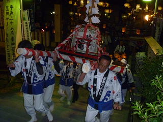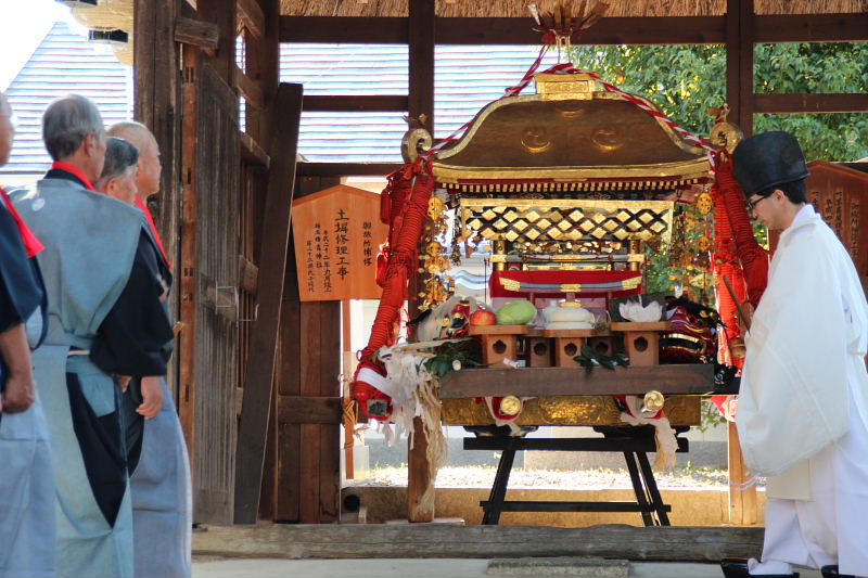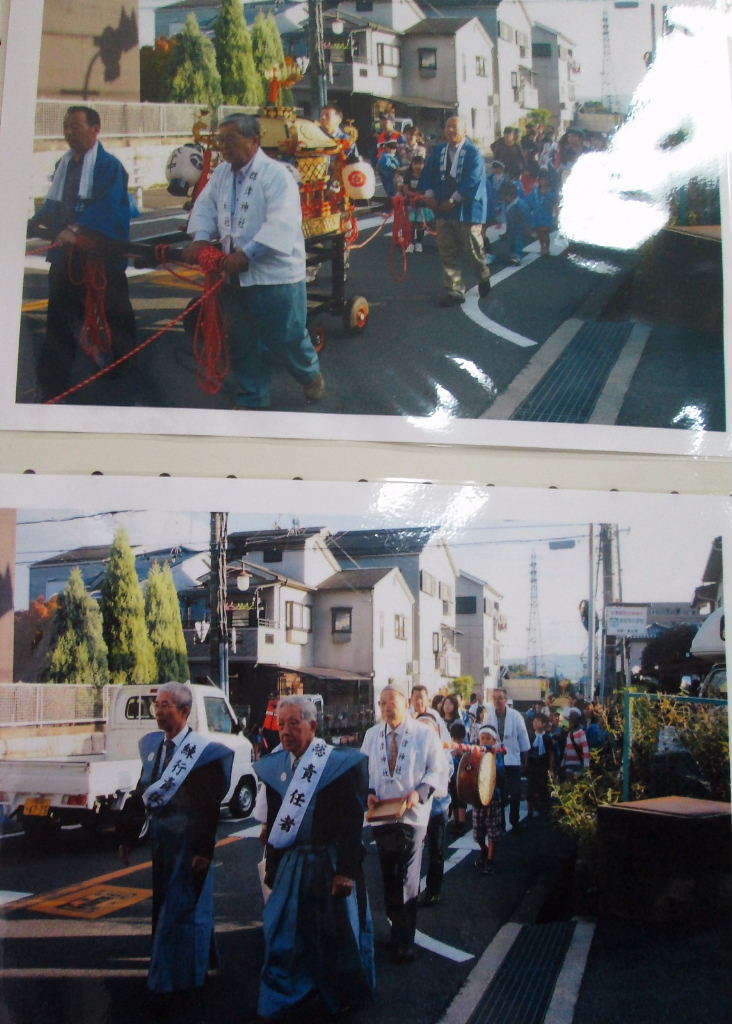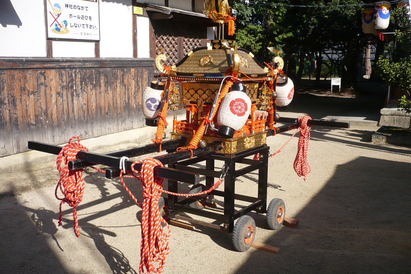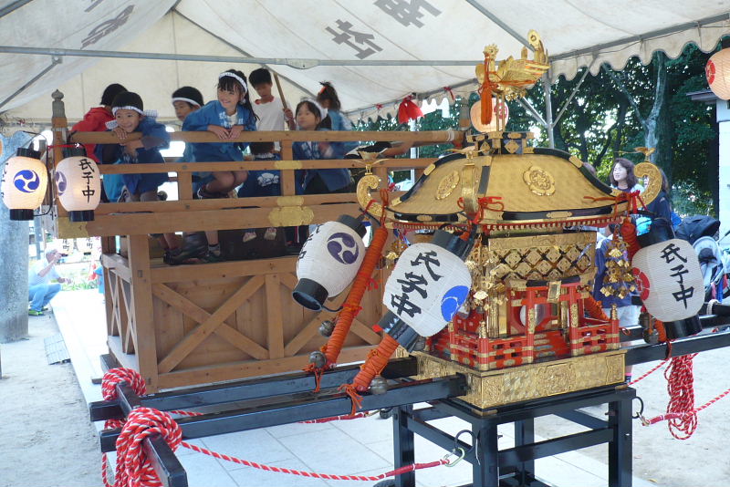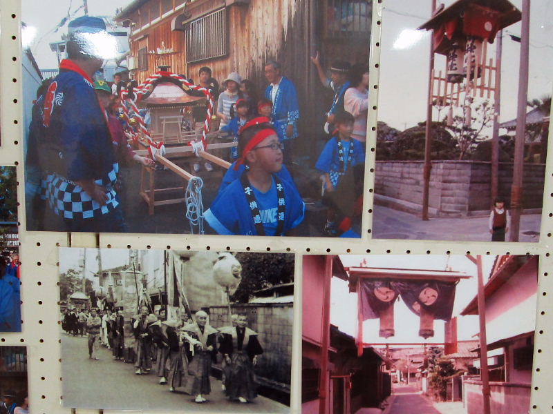 昭和23年までは地車(写真左)がありました。現在は町内で子供たちによる神輿巡行が行われています。