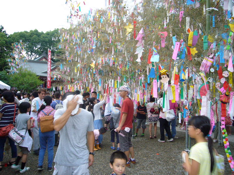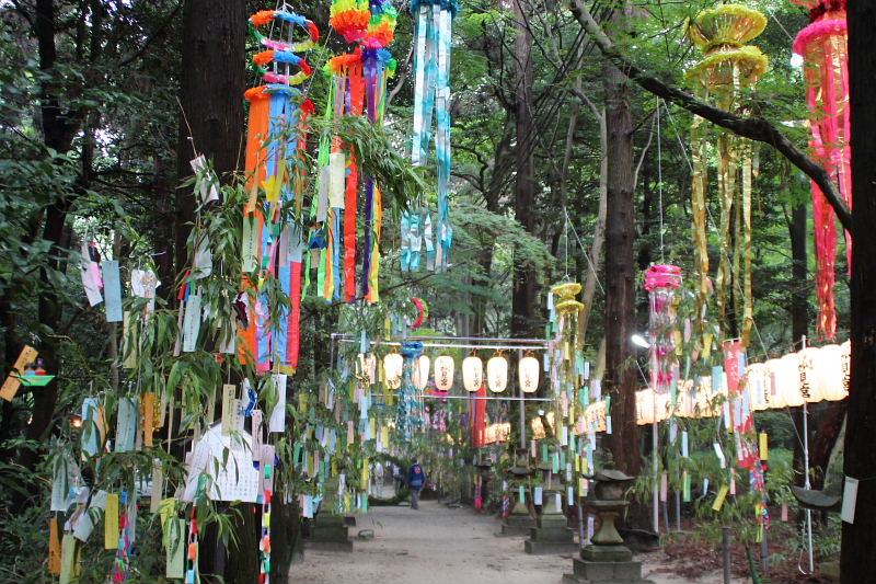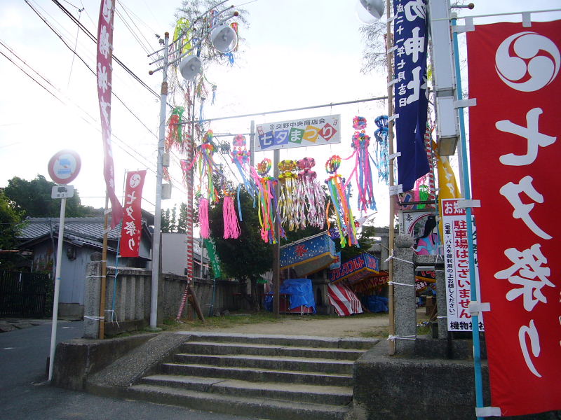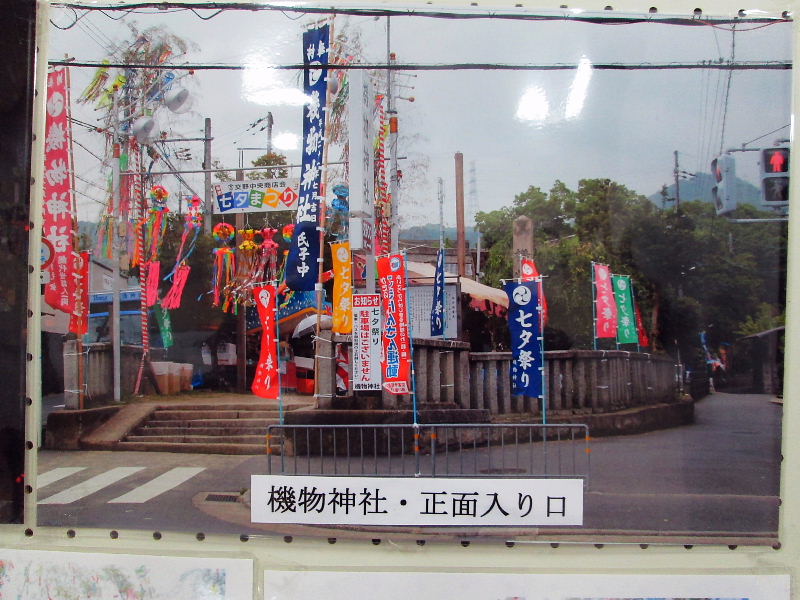 機物神社で、現在のような笹竹に願い事を書いた短冊を飾って七夕祭りを行うようになったのは昭和54年からで、近年マスコミなどで取り上げられるようになり非常に賑わって、交野の名物となっています。また、秋祭りには子供みこしが境内を巡行します。