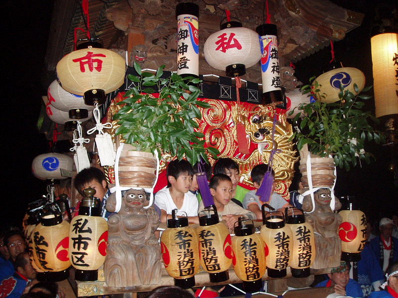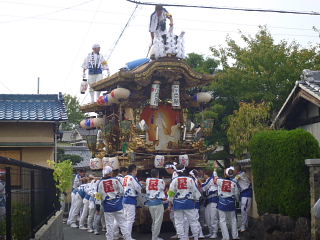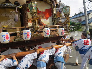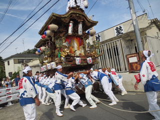 毎年、私部住吉神社の秋祭りには綺麗に飾り付けられて2台の地車が本殿の前に並びます。2台の地車のうち、本殿に向って右(東)側の車は市場・馬場 浦・札の辻・出屋敷の地区の車で、左(西)側の車は谷畑中・西崎・中町の地区の車とされています。この私部の地車は明確な製作年代は不明ですが屋台 形式を交野型といい正面から見ると幅が狭く縦長で土呂幕(泥幕)は布張であることなどが特徴です。