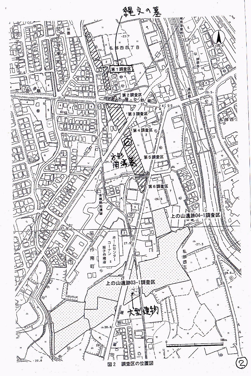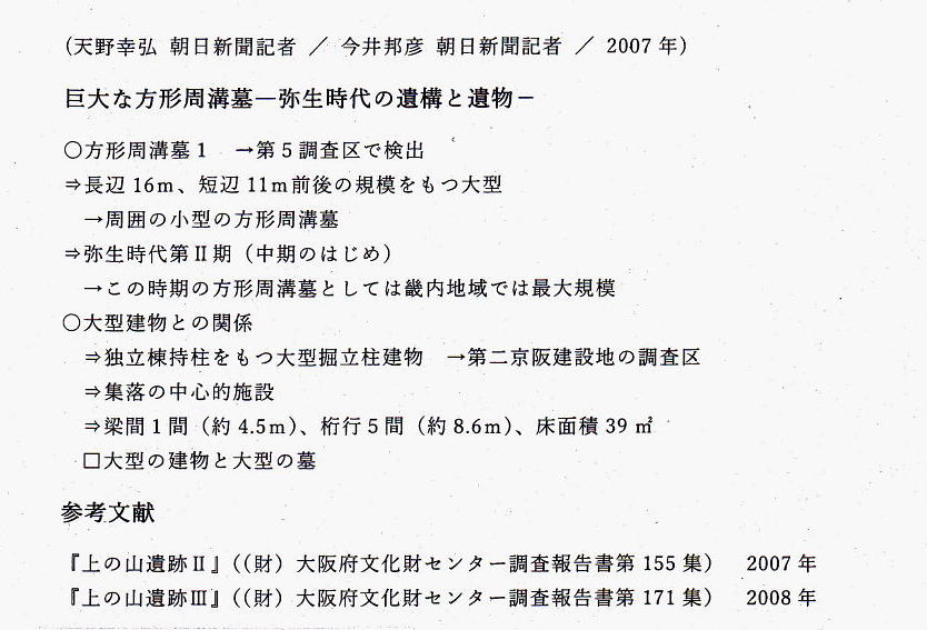 | もう13年も前ですが、2005年に(財)大阪府文化財センターに出向し、2005・2006年の2年間にわたって上の山遺跡の発掘調査を担当しました。ホームセンター・コウナンの茄子作店のあたりです。第二京阪道路に交差する府道の予定地で、想像もしなかつた縄文時代と弥生時代の遺構が発見されました。 この発掘調査を実施した場所は、いろいろ条件がわるく、現地説明会なども開催できず、広く市民のみなさんに見ていただくこともありませんでした。今回、このような機会をいただいて、交野のすばらしい歴史の一齣(こま)をしっていただくことは、たいへんうれしく思います。 |