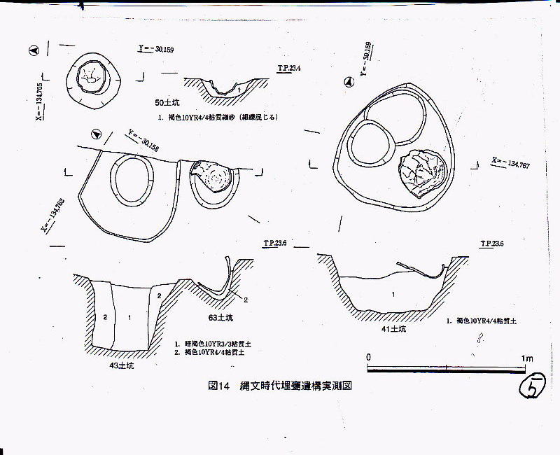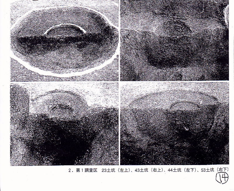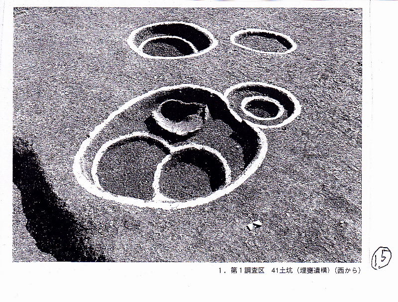 | ウッドサークル?― 縄文時代の遺構と遺物一 〇調査地の北端(第1調査区)から縄文時代の土坑が約200基 ⇒縄文時代後期(15000年前~2300年前) ○土坑の中に土器を据えた埋甕遺構 ⇒縄文時代の墓 ○土坑三つの大きさのもの ①30 cm前後 ②直径50~ 70cm ③直径lm前後 ⇒柱の痕跡が多数確認 ○南端の遺構密度の低い地点、段丘の縁辺でかなり削られている . ⇒4基の上坑が2mほどの間隔を保って円弧を描いて配置 → 1基には明確な柱の痕跡 ⇒ウッドサークル(環状木柱列)? ⇒遺構が密集している地点でも円弧を描いて土坑が分布 |