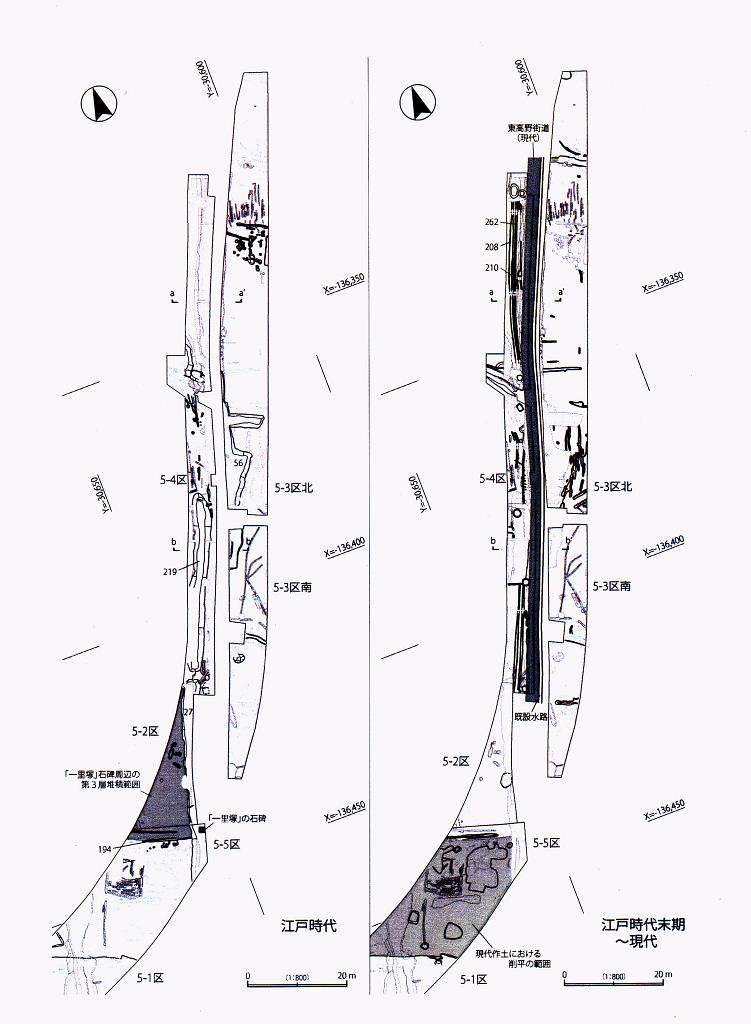 | 今回の発掘調査では、東高野街道に関係する側溝及び関連遺構、古代末から近世の水田・畠に関係する溝等を検出した。 以下では、第1節で東高野街道と一里塚に関係する調査成果について、第2節で今回の発掘調査で明らかとなった遺構・遺物の調査成果について総括する。 |
