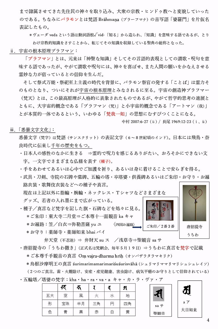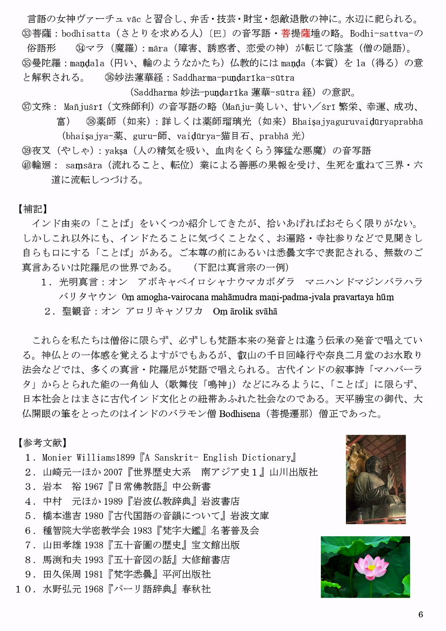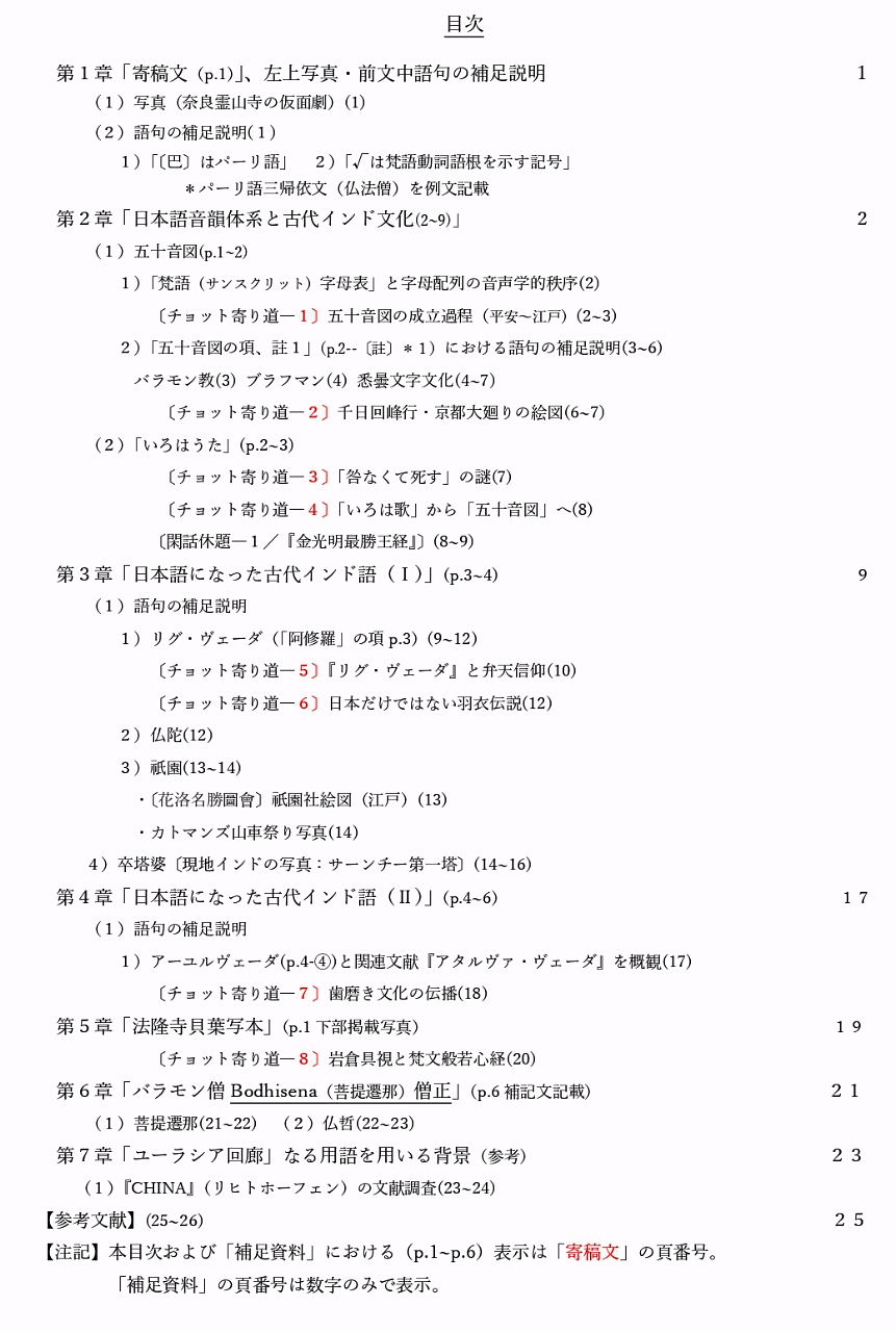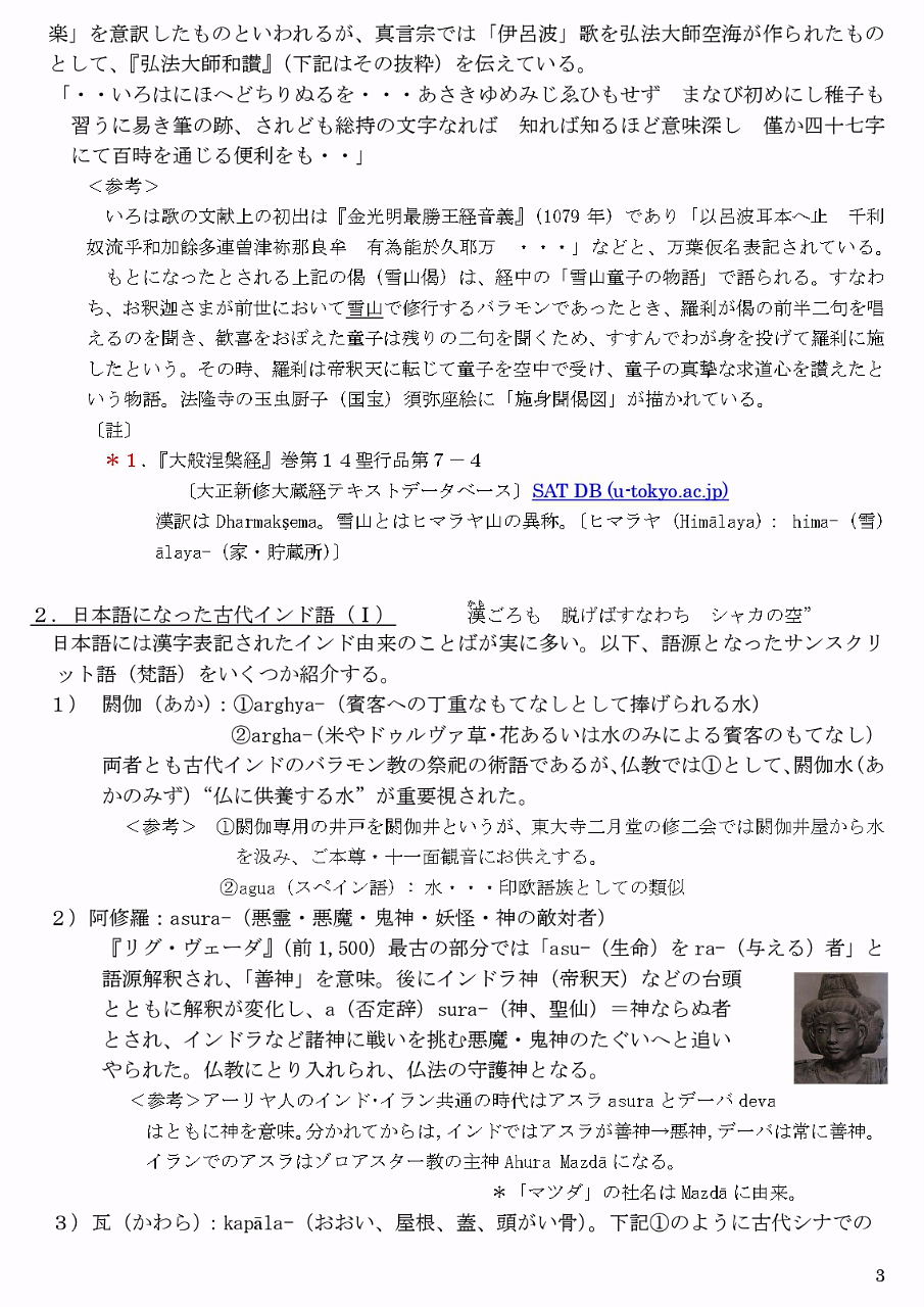 | 2024.2.24(土)午前10時、2月定例勉強会に31名が参加されました。 村田会長の挨拶で始まり、講演会は、信田隆司氏をお招きして、「日本における古代インドおよびユーラシア回廊の文化」の演題で、交野古文化同好会の50周年記念誌「調査研究編」に寄稿いただいた「日本における古代インド文化」を中心に約2時間、熱く語って頂きました。 今回の講演は、信田隆司氏が大学院でインド古典学を学ばれた中で、主に仏教を通じて伝えられ我が国の文化の基層ともなっている「言語」「ことば」に関連する分野のお話を解説頂きましたが、引き続き、第2回目の講演会として、第1回目の「復習」と「日本語になった古代インド語」などに関連するお話をお願いする予定です。 参加された皆さんより、「はじめは、古代インド文化のことが理解できませんでしたが、2時間の講演を聞いているうちに、「日本語の五十音」や「いろはの歌」、「般若心経」など身近なものとして伝わってきていることが分り、次回の講演を是非とも聞きたいと思いました。」と好評でした。 <講演概要> 1.古代インドの歴史 バラモン教〜ヒンドゥ教への変貌について 2.菩薩遷那(ぼさつせんな)の大仏開眼供養 (奈良霊仙寺の仮面劇) 3.パーリ語について ブツダのことば、真理のことば 仏法僧など 4.日本語音韻体系と古代インド文化 @五十音図 梵語(サンスクリット)字母表と字母配列の音声学的秩序 ・五十音図の成立過程 ・妙覚(みょうかく)「悉曇要訣(しったんようけつ)」の五十音図 ・浄厳(じょうごん)の「悉曇三蜜鈔(しったんさんみつしょう)」の五十音図 A宇宙の根本原理ブラフマン B悉曇文字文化(しったんもじぶんか) ・悉曇文字(梵字)は梵語(サンスクリット)の表記文字 ・日本には飛鳥・奈良時代に伝来し千年の歴史を持つ 5.般若心経と梵字について 6.「ユーラシア回廊」なる用語を用いる背景にていて 7.いろはの歌 全員で斉唱 ※今回、講師の先生のご厚意により当日配布された「レジメ6p」と「目次と補足説明資料28p」を頂戴しましたこと、記して感謝申し上げます。 |