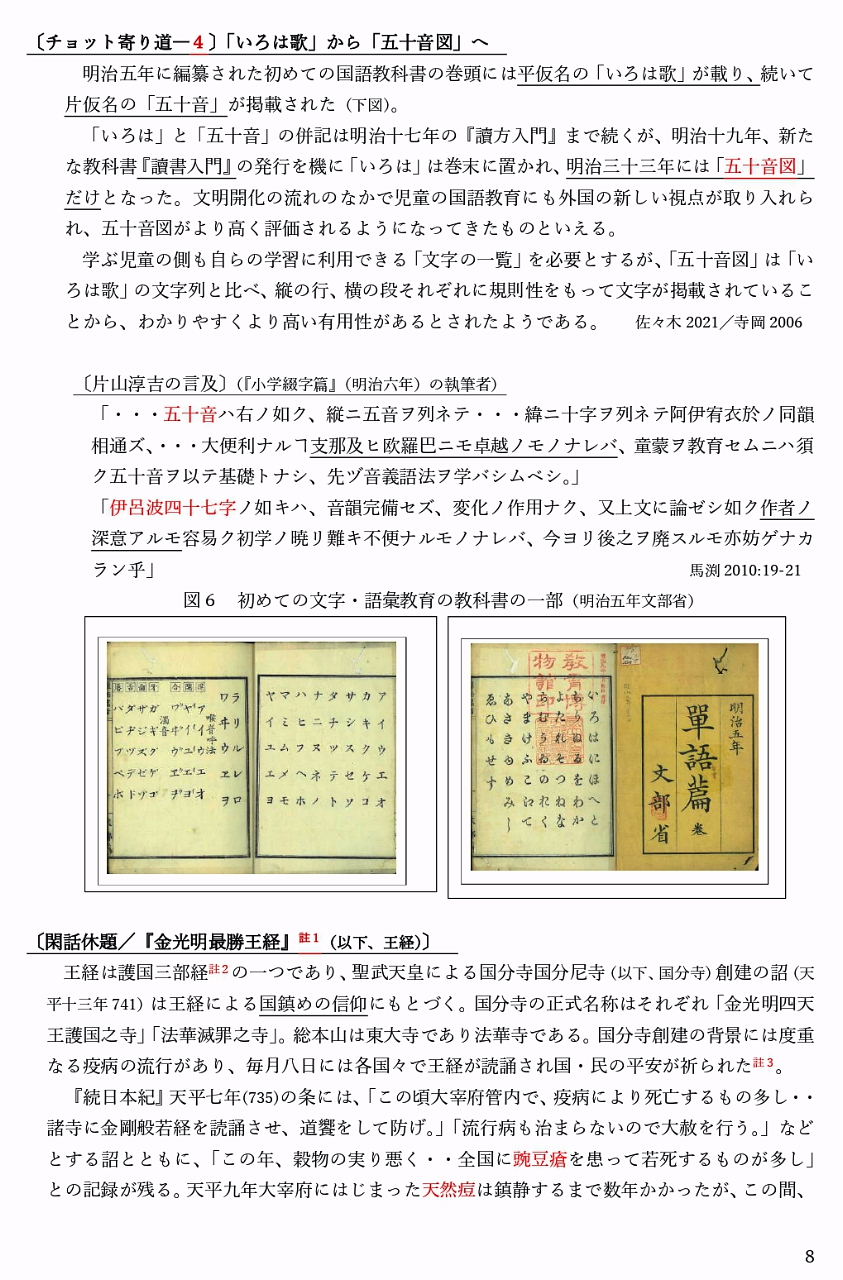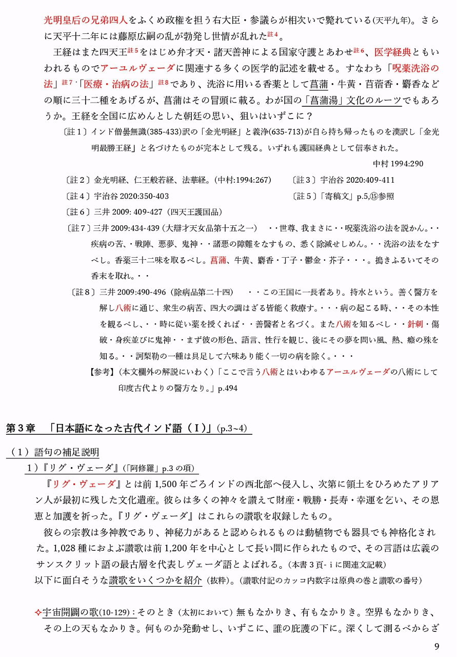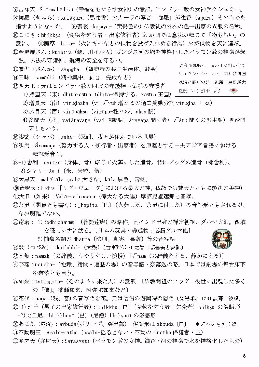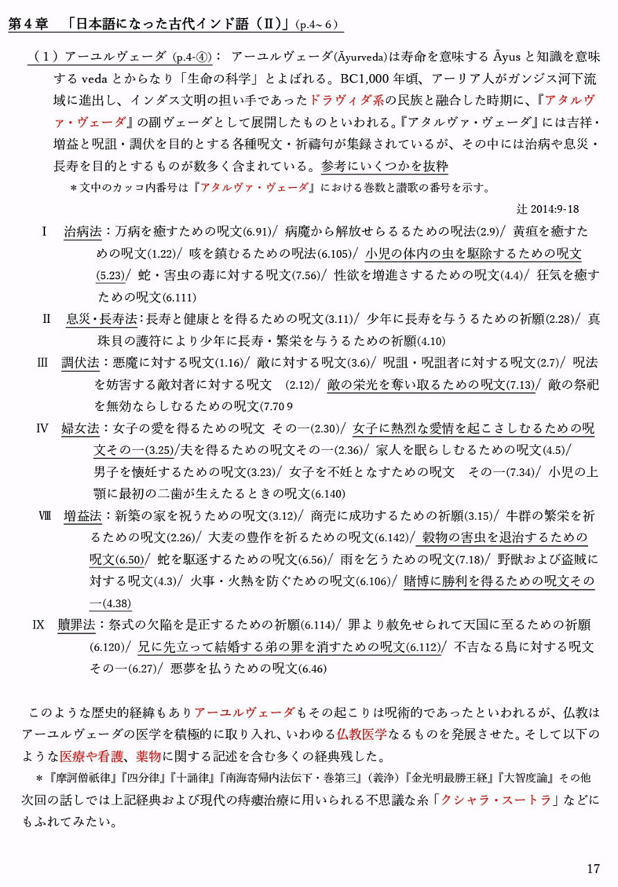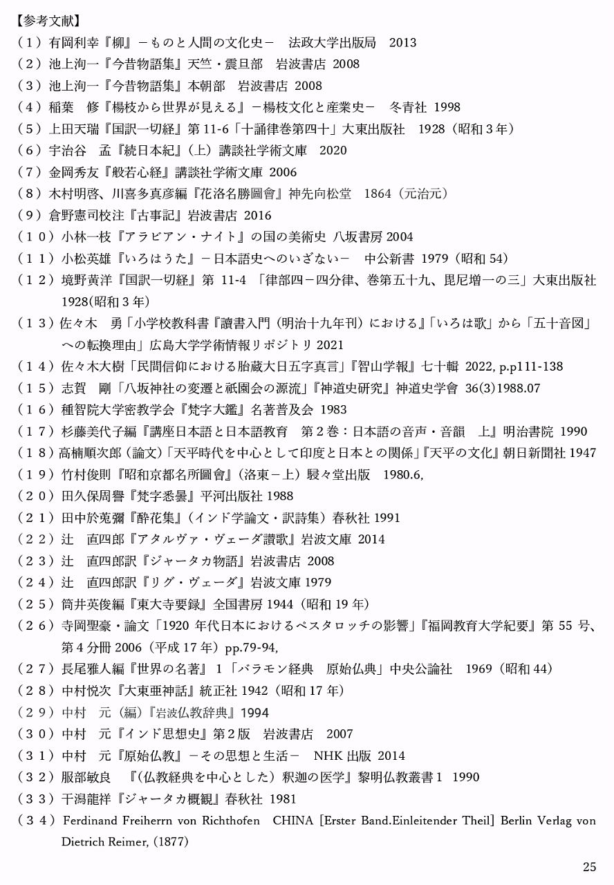 | 2024.2.24(土)午前10時、2月定例勉強会に31名が参加されました。 村田会長の挨拶で始まり、講演会は、信田隆司氏をお招きして、「日本における古代インドおよびユーラシア回廊の文化」の演題で、交野古文化同好会の50周年記念誌「調査研究編」に寄稿いただいた「日本における古代インド文化」を中心に約2時間、熱く語って頂きました。 今回の講演は、信田隆司氏が大学院でインド古典学を学ばれた中で、主に仏教を通じて伝えられ我が国の文化の基層ともなっている「言語」「ことば」に関連する分野のお話を解説頂きましたが、引き続き、第2回目の講演会として、第1回目の「復習」と「日本語になった古代インド語」などに関連するお話をお願いする予定です。 参加された皆さんより、「はじめは、古代インド文化のことが理解できませんでしたが、2時間の講演を聞いているうちに、「日本語の五十音」や「いろはの歌」、「般若心経」など身近なものとして伝わってきていることが分り、次回の講演を是非とも聞きたいと思いました。」と好評でした。 <講演概要> 1.古代インドの歴史 バラモン教〜ヒンドゥ教への変貌について 2.菩薩遷那(ぼさつせんな)の大仏開眼供養 (奈良霊仙寺の仮面劇) 3.パーリ語について ブツダのことば、真理のことば 仏法僧など 4.日本語音韻体系と古代インド文化 @五十音図 梵語(サンスクリット)字母表と字母配列の音声学的秩序 ・五十音図の成立過程 ・妙覚(みょうかく)「悉曇要訣(しったんようけつ)」の五十音図 ・浄厳(じょうごん)の「悉曇三蜜鈔(しったんさんみつしょう)」の五十音図 A宇宙の根本原理ブラフマン B悉曇文字文化(しったんもじぶんか) ・悉曇文字(梵字)は梵語(サンスクリット)の表記文字 ・日本には飛鳥・奈良時代に伝来し千年の歴史を持つ 5.般若心経と梵字について 6.「ユーラシア回廊」なる用語を用いる背景にていて 7.いろはの歌 全員で斉唱 ※今回、講師の先生のご厚意により当日配布された「レジメ6p」と「目次と補足説明資料28p」を頂戴しましたこと、記して感謝申し上げます。 |