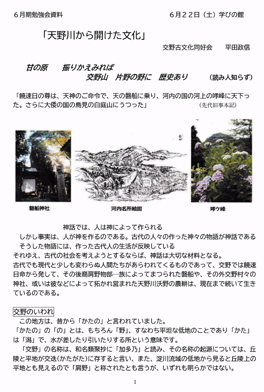 | レジメ : 『交野よもやま話』 講師 : 講師 : 平田 政信氏 |