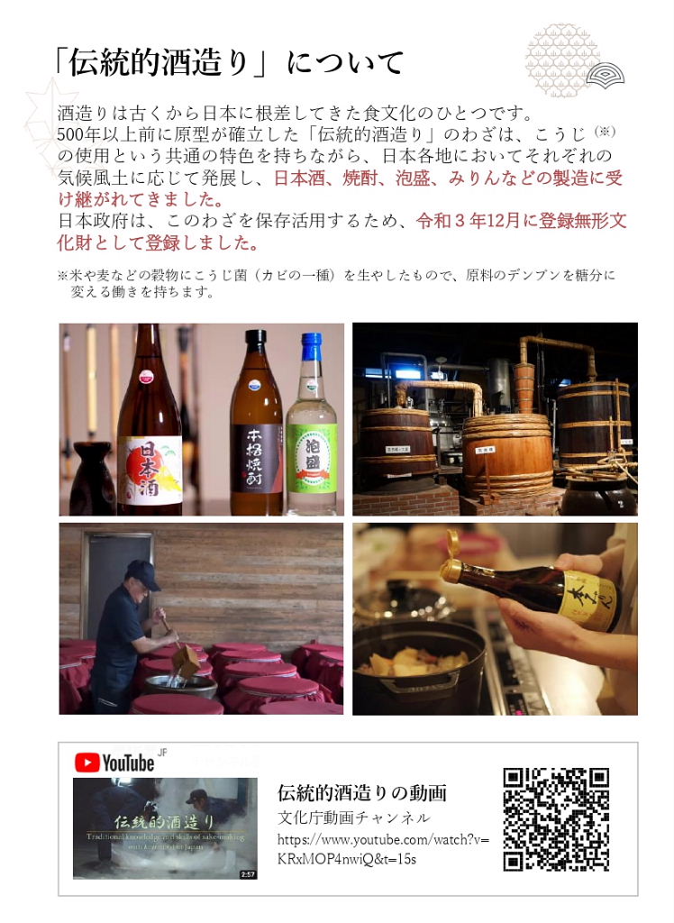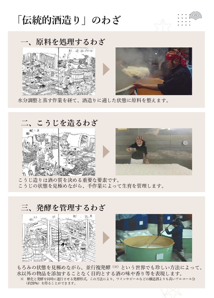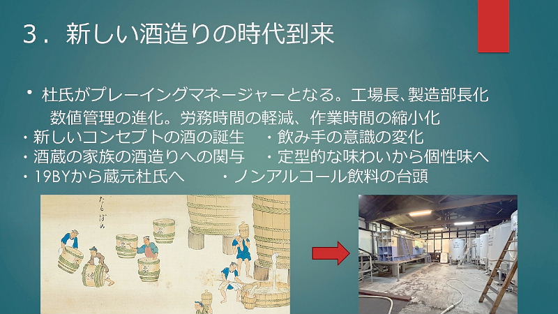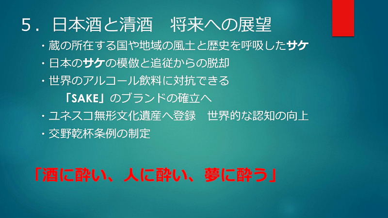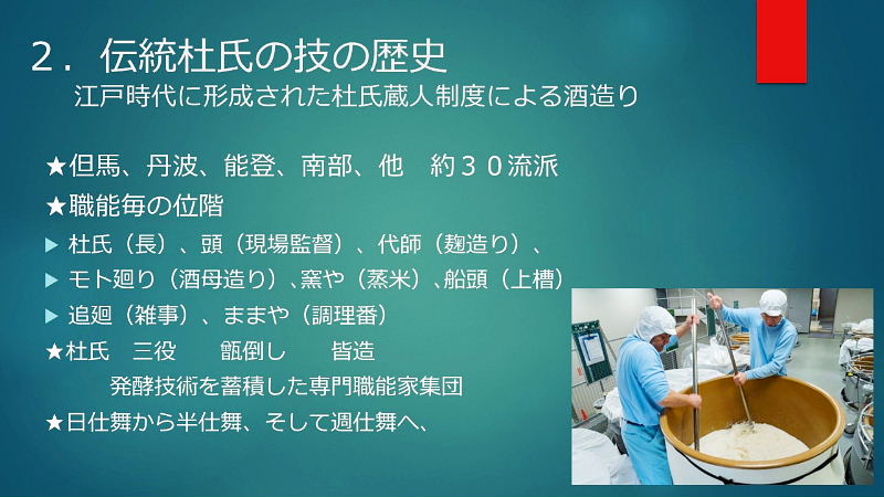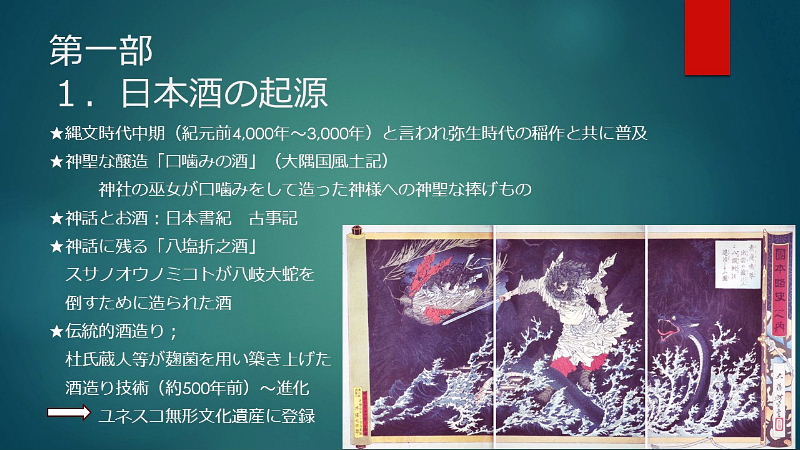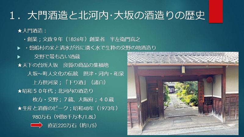 初めに; ★縄文時代中期(紀元前4,000年~3,000年)と言われ弥生時代の稲作と共に普及 ★神聖な醸造「口噛みの酒」(大隅国風土記) 神社の巫女が口噛みをして造った神様への神聖な捧げもの ★神話とお酒:日本書紀 古事記 ★神話に残る「八塩折之酒」 スサノオウノミコトが八岐大蛇を倒すために造られた酒 ★伝統的酒造り; 杜氏蔵人等が麹菌を用い築き上げた 酒造り技術(約500年前)~進化 ユネスコ無形文化遺産に登録 1, 大門酒造について 北河内、大坂の酒造りの歴史 上方摂河泉 昭和50年代 枚方・交野 7蔵 大阪府40蔵 天下の台所。良質の商品の集積地としての大坂。背景にある町人道文化の伝統 周辺の山々から湧き出る清水 肥沃な交野ヶ原の米 生産と消費のピーク 昭和48年度980万石/9億8千万本/1800ml 直近220万石 2, 伝統杜氏の技の歴史 江戸時代に形成された杜氏蔵人制度による酒造り 但馬、丹波、能登、南部、他 約30流派 職能毎の位階、杜氏(長)、頭(現場監督)、代師(麹造り)、モト廻り(酒母造り) 釜や(蒸米) 船頭(上槽) 追廻(雑事)、ままや(調理番) 杜氏 三役 甑倒し 皆造 発酵技術を集積した専門家集団 日仕舞から半仕舞、そして週仕舞へ、 3, 新しい酒造りの時代の到来 杜氏がプレーイングマネージャーとなる。工場長、製造部長化 数値管理の進化。労務作業の軽減化。作業時間の縮小化 新しいコンセプトの酒の誕生 飲み手の意識の変化 酒蔵の子弟の酒造りへの関与 定型的な味わいから個性ある味わいへの転換 19BYから蔵元杜氏 ノンアルコール飲料の動向 4,国際的な視点からみたSAKE 1990年代 黎明期 2000年代 消費の飛躍的な拡大 2010年代 現地醸造の勃興 飲み手から造り手へ 海外40蔵時代 驚異のDo it yourself精神の発揮 なんでもありの創造力と構想力 それを可能にする緩い製造免許制度 5, 将来への展望 蔵のある国や土地の風土と歴史を呼吸したサケ 日本のサケの模倣からの脱却 世界のアルコール飲料に抵抗できる「SAKE」のブランドの確立 ユネスコ無形文化遺産登録 交野乾杯条例制定 「酒に酔い、人に酔い、夢に酔う」 |