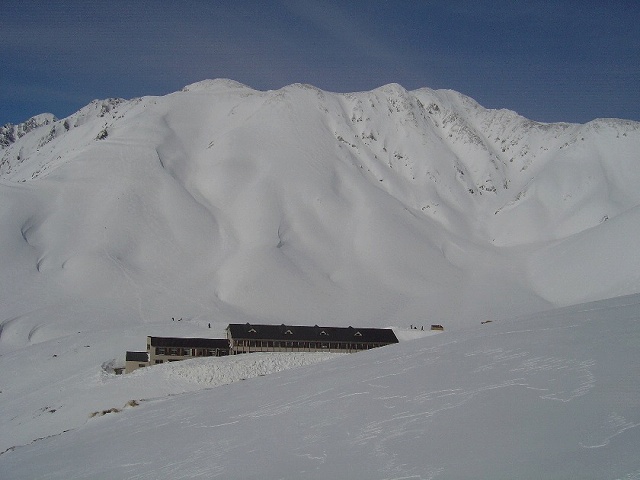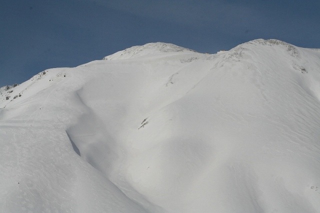 | 別山・真砂山、左の雷鳥沢を4人登っています、18日このあたりの雪崩で 一人亡くなられています、山頂に見えるのは内蔵助山荘です |