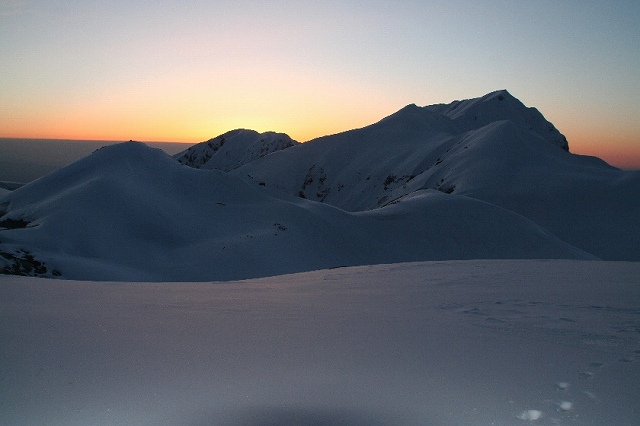 | 夕日の奥大日岳2611m、2時間も前から三脚で待っている人がいましたが I 君がまだまだと晩御飯を食べている間に、夕日は沈んだあとでした |