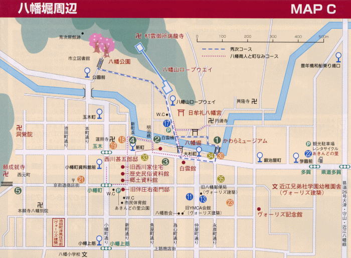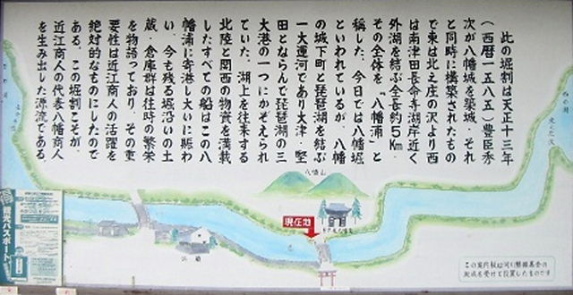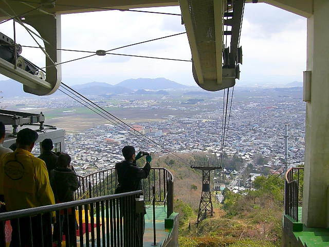 | 天正13年(1585)、秀次の築いた「八幡城」は八幡山(271.9m) の頂上にあり、紅葉の名所としても有名。四方の眺望も琵琶湖や比良山系、 眼下に整然と区画整理された旧城下町の町並みが手に取るように見渡せる。 |