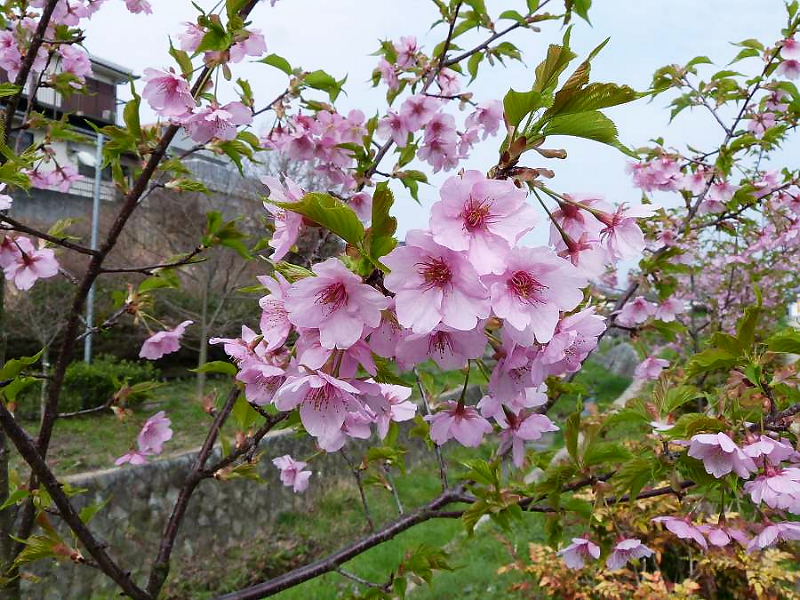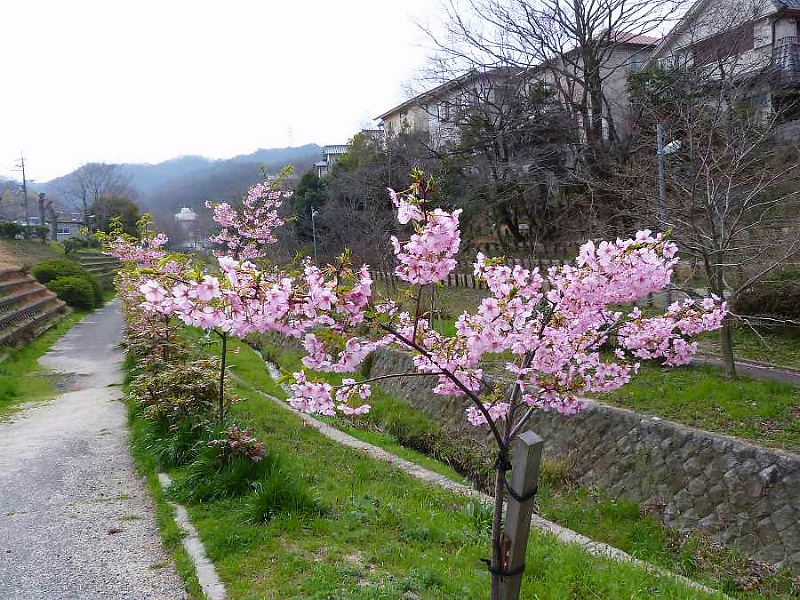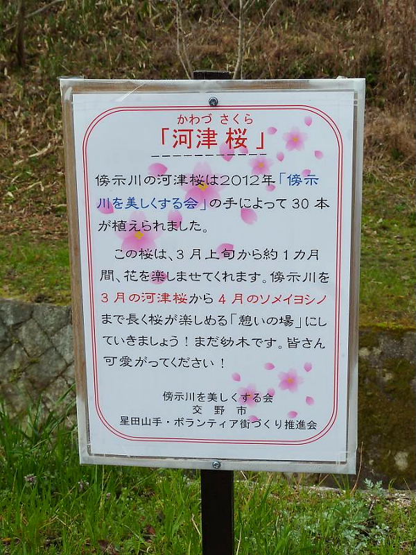 | 傍示川の河津桜が満開になりました。 昨日、朝の散歩で撮影しました。 「傍示川を美しくする会」のお蔭で、30本植えていただき感謝しています。 まだ木は細いのですが、将来はおおいに楽しみです。 新名勝になることを期待しています。 (染井吉野より2週間ほど早く咲くので、稀少価値があります) 柊南天も満開です。大島桜の1本や2本の早咲きも見られます。 3.22 南星台 毛利 信二 |