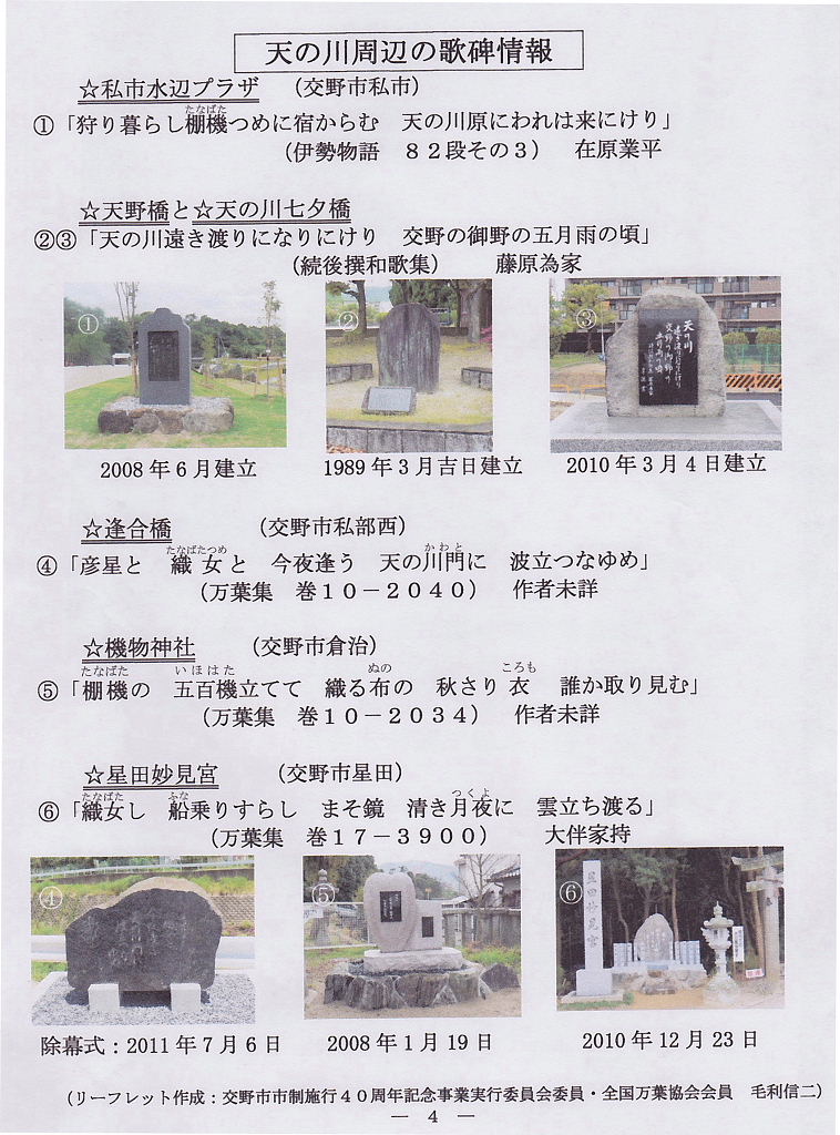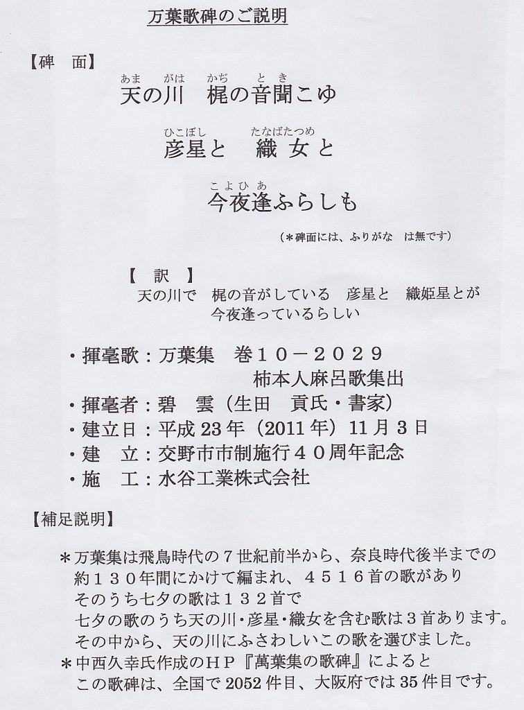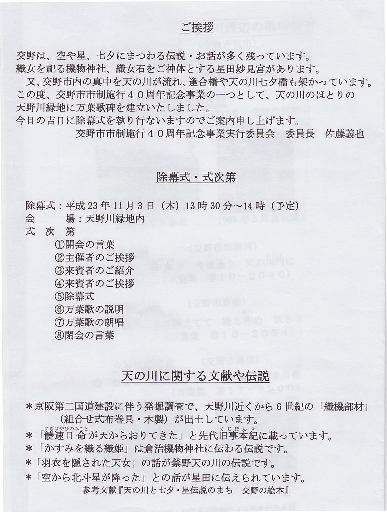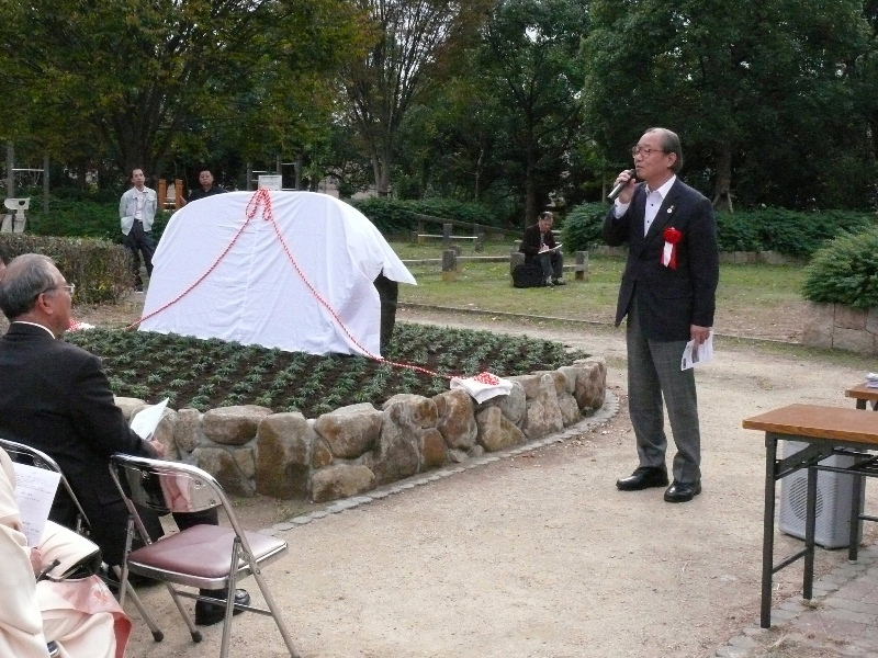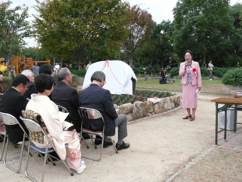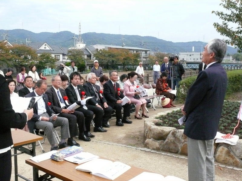 ホームページへ戻る 交野市の毛利信二さんから投稿頂きました 写真撮影は、大崎博文氏です 主催は、交野市市制施行40周年記念事業実行委員会 委員長は佐藤義也氏です。 中田市長の挨拶 除幕式 佐藤実行委員長の挨拶 全国万葉協会の冨田会長の挨拶 来賓の皆様