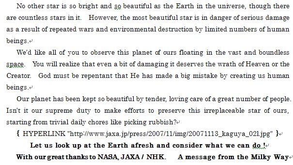 | NASA、JAXA/NHKに感謝をこめて 星に願を! Message from ☆天の川☆ |