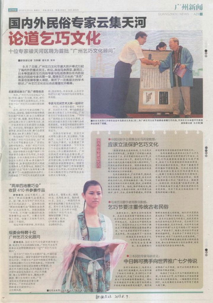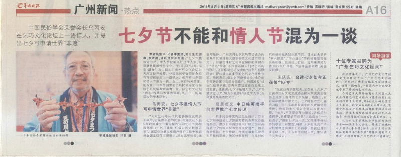 | 旧暦七夕に中国広州と台湾台南から招待を受けて両地を7日~14日まで訪問しました。 暑中見舞いと留守中のご支援に対する礼状に代えて、両地域の旅の見聞録を書きましたのでご笑覧ください。 A.先進ソフトで先進国猛追。 両地域共に公共交通機関が急速に発達し特にソフトに感心させられました。 ・広州国際空港にて 広州は伝統ある広州交易会が有名で経済界では世界的に知られたところです。空港も大きく、乗客数も多いところで当然空港は混雑するのですが航空券の自動販売機が設置されていて乗客はパスポートを入れて目的地等必要事項を入力すると自動発券されるので航空会社のカウンターでは荷物を預けるだけで時間短縮と混雑緩和に役立っています。 このように書くと大変スムーズだったようですが航空券自販機は慣れるまでは時間がかかり、大奮闘させられました。 ←南方航空の航空券自動販売機(Self Check-in) ・台湾新幹線(高鉄)桃園駅にて B.二人の通訳 広州七夕国際フォーラムで小論を発表する機会があり私をサポートする通訳は何伍君さんという若い女性でした。彼女とは論文を送る段階から交流を続けました。彼女からの最初のメールに「何(か)さん」と呼んでくださいと有りましたが君と云うのは日本人にとっては男性の呼称なのでメール交信の時には時々男性と誤解して文章を書くこともありました。しかし、日本でも「葵の君」「淀君」等のように君を使っていた時代がありました。 彼女の文章は所謂「てにおは」が混乱していることもありましたが理解力も事務処理能力にも優れていたので大いに助かりました。 台湾のピーさんは台湾の年配者には珍しく日本語は出来ませんでしたのでメイリさんがピーさんとの仲立ちをしてくれました。この二人の通訳の場合にはこちらが奮闘するのではなく、むしろ気を使う立場で大いに奮闘したのは彼女たちでした。学会の通訳には語学力に加えてテーマ(七夕伝説)に対する理解力と両国の多様な文化知識が必要でした。 C.スマホとPCの活用 広州の若者のスマホの活用はすざましいものでほぼ100%が活用していた。通訳の途中でも辞書代わりに活用し、知らない問題も即座に問題を解決した。所謂携帯電話の単独使用は最早見られなかった。台湾のPiさんはホテルのオーナーで年配者ながらパソコンを自由に使いこなしていた。 D.政治、外交問題 広州では政治問題が心配されたがその心配は現地では一切感じられなかった。懇親会では例によって男性年配者が「北国の春」を歌うサービス振りであった。サービスと云えば懇親会の前に通訳の何(か)さんからサプライズがあるかも知れないと教えられていたが突然バースデイケーキが出された。これは私が講演の中で今年77歳にになった今、七夕(7月7日)の節季に因んだ七夕伝説について語ることは誠に光栄であると話したことが原因だったようだ。本当の誕生日は2月なのですが通訳に誤解があったのではなく、今年77歳と解し、大陸的アバウトの考えで発案されたものと思い些細な訂正はしないことにした。 今回は通訳だけでなく石書記の代理で参加した陳さんをはじめ台湾、香港組共に女性が圧倒的に多かった。因みに陳さんの名刺を見ると常務委員で統戦部長と云う厳めしい肩書でしたが笑顔を絶やさない聡明な女史でした。 経由地の台北で見学した台湾国立博物館では児玉源太郎総督及び後藤新平民政局長官(当時)を顕彰する髭の銅像が設置された記念コーナーが顕在だった。台南では華南開発で有名な八田与一博士を顕彰する役所が活躍していた一方で「陸軍用地」跡と刻まれた瓦葺の和風の小屋が遺されていたのは戦時の痕跡を全て消そうとしている国とは彼我の差を感じた。 E.七夕乞巧伝説の継承 本題は別途報告するのでここでは簡単に触れて置く。 広州乞巧節(七夕祭)は天河珠村で800年以上受け継がれたものを2005年から「広州乞巧文化節(広州七夕文化祭)」とし、政府の行事として行ってきたものを更に拡大、国際化するために私をはじめ、台湾、香港から10人の顧問が招聘されました。私を推薦したのは今年交野が原の七夕史跡を見学に来た台湾グループのPiさんだったようです。更に日本の他都市は旧暦の同時期に七夕まつりをしていたので交渉に手間取ったと推定されるが来年以降には他の都市も参加するものと思われます。私は講演の中で、国際サミットと七夕博物館の建設を提案したが広州では七夕博物館がタイミングよくオープンした。 広州乞巧文化節及び講演会の内容については現地新聞の写真と記事を参照ください。 羊城晩報の記事は以下にもあります。 http://news.sina.com.tw/article/20130809/10357404.html 台南の七夕まつりは市内各地に存在する寺院を中心に16歳の成人を祝う行事として街ぐるみで又学校の行事としても行われていました。約10kgの新米袋を肩に担いで「十六歳」になると「七娘媽」へのお供え物が置いているテーブルをくぐった瞬間に大人の仲間入りをし、それを祝うかのように