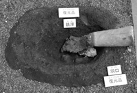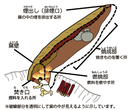 交野では、古墳時代の初期は、弥生式土器に似た赤っぽい色の土師器という土器が作られていましたが、中期には日本に伝わってきた須恵器という新しい焼き物も作られるようになりました。 須恵器は、下の図のような「あな窯」という長く大きな窯を使い、1,000℃以上の高温で硬く焼き上げ青灰色に仕上げた焼きものです。 上の山遺跡と茄子作遺跡(枚方市)の調査で、遺跡近くから伝来して間もないころの須恵器の窯があった可能性が高くなりました。 また、寺地区の大谷北窯跡では、古墳時代の終わりごろの須恵器窯から出た灰や失敗品を捨てた場所が見つかっています。 須恵器は市内の集落で数多く発見されており、日常的に使われていたようです。 また、土師器にも「こしき」という煮炊きに使う新しい種類の土器が加わるなど、土器文化全体に大きな変化がありました。 |