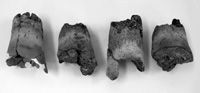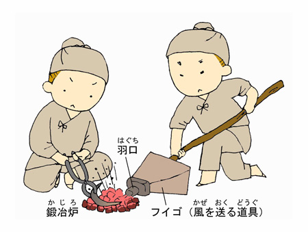 新たな生産技術の中で、重要だったのが、鉄を加工して道具を作りだす鍛冶の技術でした。 もともと日本で行われていた鍛冶に朝鮮半島から伝わった鍛冶技術が加わり、鍛冶生産は急速に発展します。 また、交野は古墳時代、鍛冶生産発展の中心地のひとつだったことがわかっています。 森遺跡の発掘調査で、羽口という鍛冶の道具や鍛冶炉、鉄滓(鉄製品をつくるときに出た鉄くず)など鍛冶に関するものがたくさん見つかりました。 その量の多さから、交野で行われていた鍛冶生産は、当時の日本で五本の指に入る規模だったと考えられています。 鉄は農具・工具などの生産道具から刀剣・甲冑などの武具まで、道具を作るために欠かせない素材であり、古墳時代の交野の鍛冶は、当時の日本全体で重要な役割を果たしていたと考えられます。