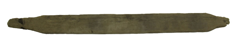 先月号で紹介した倉治古墳群で見つかった紡錘車という糸紡ぎの道具は、森遺跡でも見つかっていて、集落の中で機織りに関わる作業が行われていたと見られます。 さらに、最近では上の山遺跡のすぐ隣にある茄子作遺跡から、とても珍しい古墳時代の織機(機織りに使われた道具)の一部が見つかりました。 発見された部材が、なぜ織機の一部だとわかるのかというと、細かい糸の痕跡が部材の表面に奇跡的に残っていたおかげで、織機の部材であることがわかりました。 木製品は、土中で腐ってしまいやすいため、発掘されること自体も貴重なことです。 また、この織機の部材は、古墳時代のものとしては、日本中でこの一例しか確認されていないとても重要な文化財です。 しかし、この部材と組み合わさるような織機の部品の発見例がほとんどないため、織機の構造や特徴については謎のままです。 ただ、古墳時代以前の日本の織機にはない部材の形をしており、古墳時代以降に新たに伝わった織機であることははっきりしています。 おそらく、須恵器や鍛冶などの技術とともに交野に伝わってきたのでしょう。 この織機の部材は、交野で千年以上昔に機織りが行われた証拠であるとともに、日本の機織りの歴史を変える可能性を秘めた出土品なのです。 この織機の部材は、企画展示「七夕伝説と星の信仰」で展示しています。