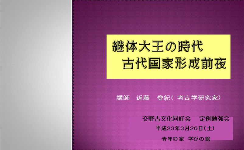 | 定例勉強会 青年の家 学びの館 3/26 午前10時 (21名の参加) 継体大王の時代 古代国家形成前夜 講師:近藤 登紀氏(考古学研究家) |