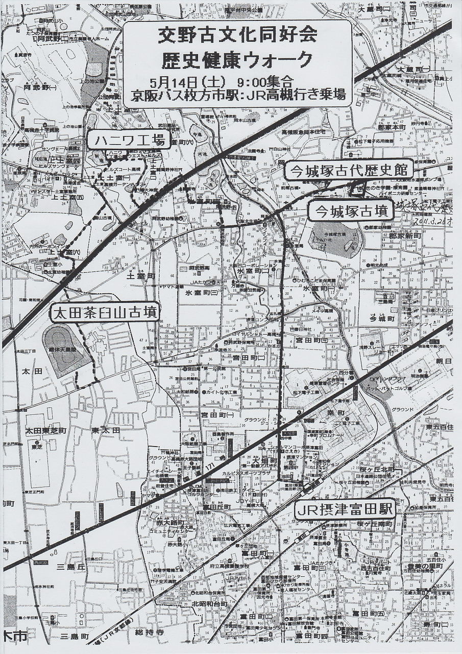 | 5月14日(土)、歴史健康ウォークで、今回勉強しました 「今城塚古墳とハニワ工場公園」を、講師の近藤先生の案内で巡ります。 集合:枚方市駅・JR高槻駅行きバス停前 午前9時 です。 皆さんの参加をお待ちしております。 |
