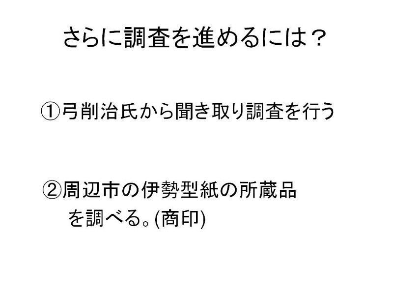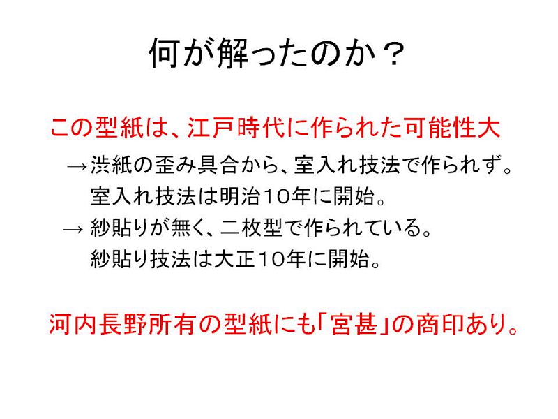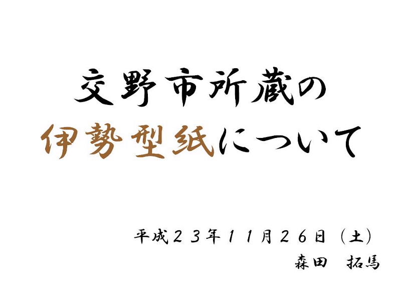 | 「交野市所蔵の伊勢型紙について」 森田拓馬 2011.11.26(土) @伊勢型紙とは A交野市所蔵の伊勢型紙 B仮説という名の妄想・迷走 C結局、何が分かったの? @伊勢型紙とは 和紙を柿渋で塗り重ねた渋紙(型地紙)を掘り抜いた、主に型染作業で使用される道具です。 現在の三重県鈴鹿市白子・寺家地域に伝わる伝統産業で、伊勢型紙彫刻技術が「重要無形文化財」(文部科学省)に、伊勢型紙が「伝統工芸用具」(経済産業省)に指定されています。 A交野市所蔵の伊勢型紙 現在交野市には、平成21年に市民の方から寄贈された251枚の伊勢型紙が所蔵されています。その来歴については不明な点が多く、「いつ」「どこで」「誰によって」作られたものなのか、そして「いつ」「どこで」「何を染めるのに」使われた型紙なのかを確定できないか、 調査が始まります。以下は聞き取り調査の結果と、文化財事業団への寄贈後の展示記録です。 1970年代? 奥野平次氏の手元にあった。その後、大阪市立大学生活科学部繊維学科教授 弓削治氏(青山)に研究資料として貸し出される。 1980年代 弓削氏の転居に伴い、同僚だった市内在住の一ノ瀬秀文氏に預けられる。 一ノ瀬氏は青年の家に届けるが、対応した職員は寄贈を受けなかった模様。 その後、20年以上にわたり一ノ瀬氏が保管して下さる。 2009年 一ノ瀬氏、高尾秀司氏案内のウォーキングに参加。高尾氏の連絡により、 交野市文化財事業団が型紙の寄贈を受ける。 劣化していた型紙の清掃、調査を行なう。 2010年 交野市教育文化会館にて企画展「伊勢型紙の世界」展が行なわれる。 2011年 企画展「ちょっとエコな民具たちpartU 〜紙のリサイクル展〜」 B仮設と言う名の妄想・迷走 現在の所蔵機関としては「交野市域で使用されていたのか、否か」を判明させたい。そこで1970年代以前の来歴について、門外漢の私が妄想してみました。 仮説その1 型紙は全て交野市で作られ、交野市内の染め屋で使用された。 「勢州・白子」という商印の型紙がある。全て交野市で作られたわけではない。 仮説その2 商印の押された型紙は白子・寺家で作られたが、商印のないものは交野で作られた? →全ての型紙に商印が押されているわけではない。 →職人でなくても作れそうな、作りの荒い型紙がある。 →墨書が浮かび上がる型地紙がある。型地紙(渋紙)を転用紙で作った? →そういわれてみると、出来の悪い、収縮した型地紙がある!自家製型紙か? →墨書を読めば、その記述内容から地域=型紙の産地がわかるのでは?! 染めに使われて見えなくなっていた商印もいくつか見つかった。 しかし、墨書の内容は交野地域どころか、関西地域以外も含まれる。 墨書の転用紙で作られた型地紙は、白子・寺家でも作られている。 収縮した型紙は、型地紙の製造方法の違いによるもの。 C結局、調査によって何が解ったのか&今後の課題 |