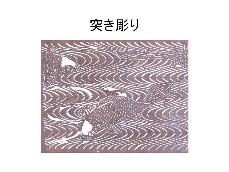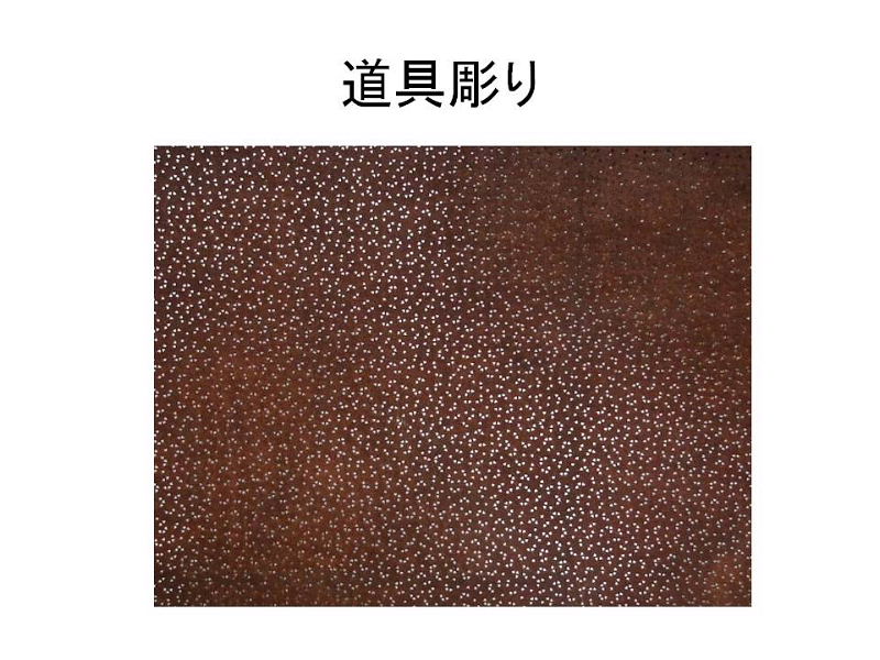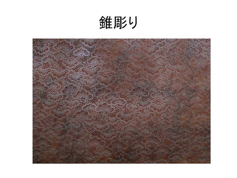 | 刃先を花や扇、松などの形に加工した道具刃物を使用し、ひと突きで紋様を彫刻する技法です。 均一な紋様を彫ることができ、他の技法と組み合わせることで色々な表現ができる特徴があります。 江戸時代の終わりごろから流行した技法とみられます。 |