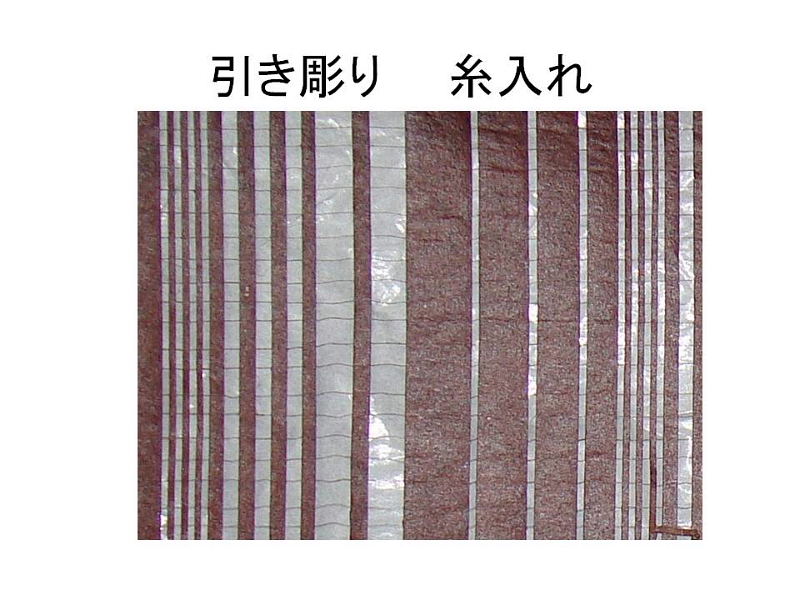 | 小刀を手前に引いて型地紙を彫る技法です。 元々縞柄〔しまがら〕を彫るため(縞彫〔しまぼり〕)に発達した技法であり、 定規を使用して均等に縞柄を彫ります。 縞を彫るためには同じ場所を小刀でなぞるため高い技術が求められます。 彫り残された部分が弱く固定しにくいため、糸入れが必要となります。 彫り残しの少ない型地紙は染色するときに紋様がずれるおそれがあるため、 糸入れという技法で補強します。 糸入れ用の型地紙を使用し彫刻した後に2枚に剥がし、 紋様に応じて絹糸を縦・横・斜めに張った後、柿渋で元通りに貼り合わせます。 |