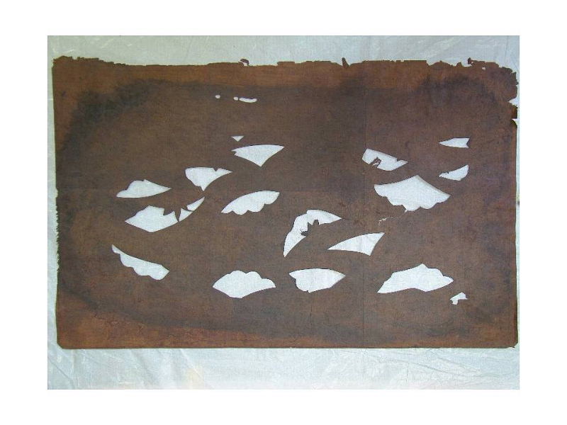 | 5〜 8枚の型地紙を重ねて敷板〔しきいた〕(穴板〔あないた〕ともいう)の上に置き、 小刀で垂直に突き刺すように彫りすすめていく技法です。 突彫用の小刀の刃は長さや幅を彫る紋様にあわせて使用しやすいように 職人の手で加工が施されています。型紙の彫刻技法の中で最も古い技法です。 |