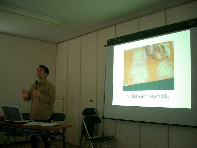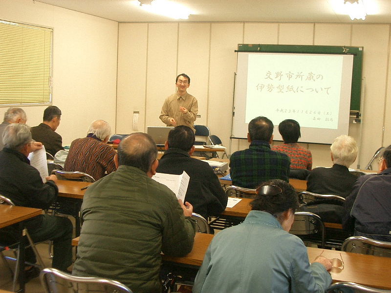 | 2011.11.26(土)午前10時より、11月定例勉強会に14名の方々が参加されました。参加された方の内訳は会員9名に加えて、「会報かたの」催しページなどを見られて参加された方が5名であった。 中会長の挨拶の後、村田氏の司会で始まり、昨年7月に交野市歴史民俗資料室で開かれた特別展「伊勢型紙の世界」、今年8月〜10月に開かれた特別展「ちょっとエコな民具たち〜紙のリサイクル展〜」には沢山の市民の皆さんが見学され、型紙作りの体験をされた事と講師の森田拓馬氏のプロフィールが紹介された。森田氏は、特別展を開くに当たり、寄贈を申し出られた一ノ瀬秀文氏や伊勢型紙の生産地の三重県白子地区などを訪問、伊勢型紙についていろいろと貴重な資料を収集された。 今回の勉強会は、「伊勢型紙について」をテーマに現地で収集された沢山の貴重な資料と自作の赤外線カメラで撮影された写真などをパワーポイントを駆使して大変分かり易くご講演いただきました。講演の中、特に伊勢型紙を赤外線カメラで撮影し浮かび上がった商印や墨書き文字から生産地を解明する手法に、新鮮味を感じ大変驚いた。 講演後、伊勢型紙を長年保管され2年前に交野市に寄贈された、一ノ瀬氏のお話などを伺がった。今後は、奥野平次氏がいつどのようにして伊勢型紙を手元に持っておられたのか、どういう経緯で研究資料として弓削氏に貸し出されたのかとなど、当時の事情を聞きとりしたり、また周辺地域の所蔵品(商印)などを調査して、どこで、誰によって作られ、何を染めるために使われた型紙なのかなどが解明されることを期待したい。 HPの掲載に当たり、講師のご厚意で当日配布されたマニュアルやパワーポイントの資料などを提供頂きましたこと、記して感謝申し上げます。 |