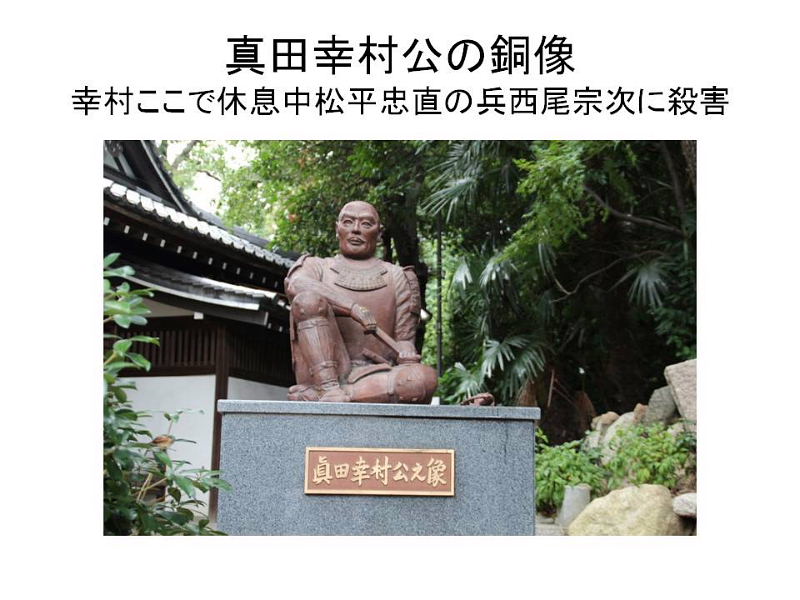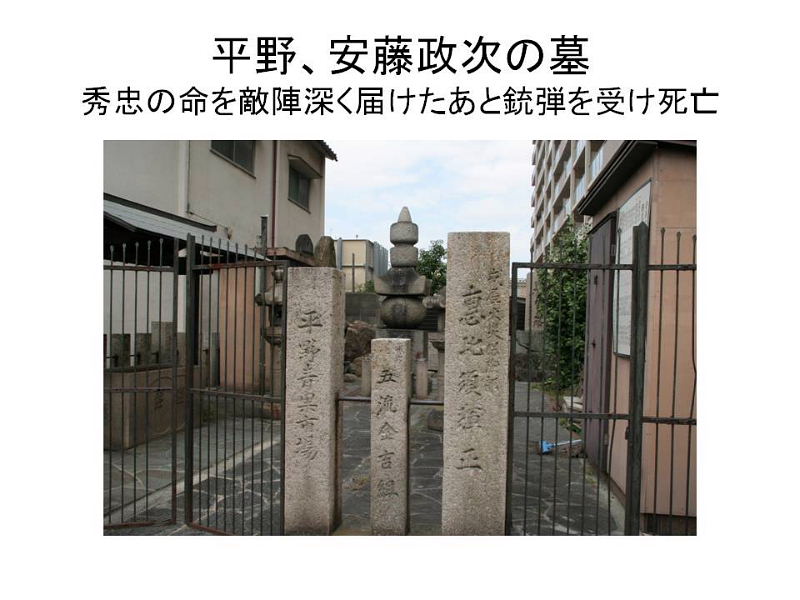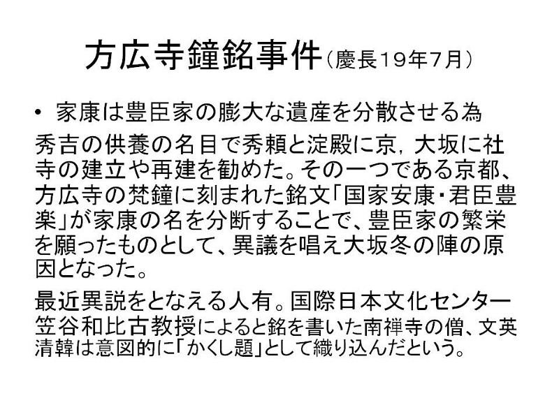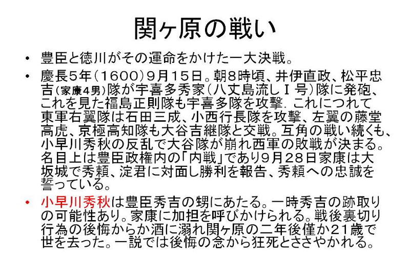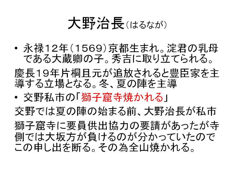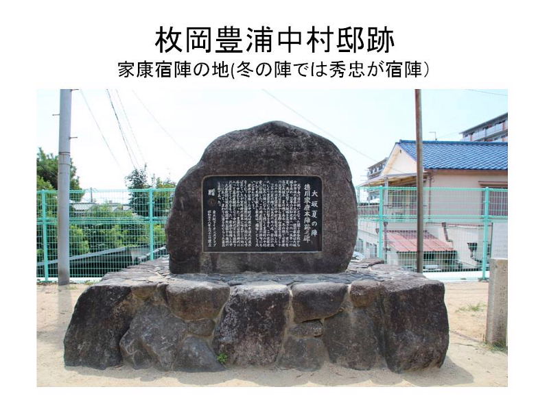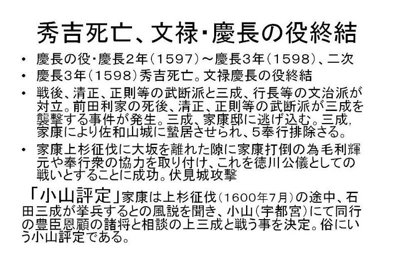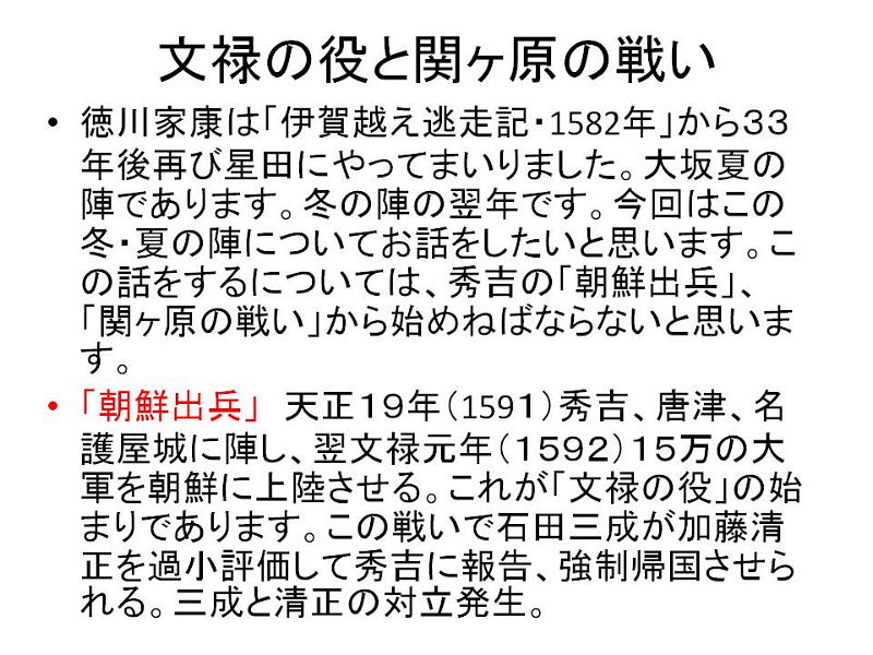 | 「文禄の役と関ヶ原の戦い」 徳川家康は前回お話をした「伊賀越え逃走記・1582年」から33年後、1615年(慶長15)再び星田にやつてまいりました。大坂夏の陣であります。前年の大坂冬に陣の後であります。今回はこの冬の陣、夏の陣についてお話をしたいと思いますが、冬の陣・夏の陣を語るには秀吉の「朝鮮出兵」と「関ケ原の戦い」から話を進めねばならないと思います。 「朝鮮出兵」1592年(文禄1) 秀吉唐津名護屋に陣し、15万の軍が朝鮮に攻め入る、これが「文禄の役」であります。この戦いで三成が清正を過小評価して秀吉に報告。強制帰国させられる。この為、加藤清正と石田三成が対立(武断派、加藤清正・福島正則対 文治派、石田三成・小西行長) 「慶長の役」1597〜 1598(慶長3年)二次派兵 「秀吉の死」1598年(慶長3年) 秀吉の死亡によりこの戦いは終わりをつげる、五大老による決断、当時の五大老 前田利家 徳川家康、宇喜多秀家 小早川隆景 毛利輝元、五奉行(前田玄以、浅野長政、増田長盛、石田三成、長東正家) 「石田三成」 近江佐和山城主、19万石。豊臣5奉行筆頭格、前田利家の死後、武断派に襲撃され、家康邸に逃げる。(武断派・清正、正則、池田輝政、黒田長政、細川忠興、浅野幸長、加藤嘉明の七将) 家康の裁断で佐和山城蟄居、奉行解任 「石田三成の挙兵」 三成、家康に弾劾状を発し伏見城を攻め関ヶ原の前哨戦が始まる。 「小山評定」 家康、上杉征伐の途中、1600年7月19日 大坂の増田長盛より江戸の家康の元に12日付けの書状が届く。内容は上杉征伐に従軍予定の大谷吉継が三成と共に挙兵するという風説である。家康は予定どうり21日江戸を出発24日小山に到着。秀忠はじめ全軍の諸将は小山に召集された。これがのちに「小山評定」と呼ばれる。参加したのが豊臣恩顧の福島正則、細川忠興、山内一豊らでこの「小山評定」で彼等が三成と戦う事に決す。 「関ヶ原の戦い1600年(慶長5年)9月15日 「西軍」 石田三成、小西行長、島津義弘、宇喜多秀家、大谷吉継、小早川秀秋(最後東軍に)等 総勢約8万4千人 「東軍」 徳川家康、福島正則、藤堂高虎、井伊直政、黒田長政、本田忠勝等総勢 約7万4千人 ☆譜代の直臣で構成する秀忠軍参戦出来ず。(榊原康政ら) 「合戦の内容」 天下分け目の合戦で有名な関ヶ原合戦は、豊臣と徳川がその運命をかけた一大決戦であった。この朝8時頃井伊、松平軍が先ず進出して宇喜多隊に向つて戦端を開いた。これを見た福島隊はこれも宇喜多を攻撃した。かくて戦機を得た東方に陣取る諸隊は石田、小西の隊を攻撃、左翼の藤堂・京極隊も大谷隊と交戦し戦いはたけなわとなった。ここにきて家康の激に反応して小早川秀秋が反旗をひるがえして大谷隊を攻めた。この為大谷隊が壊滅し形勢が一気に逆転し西軍の敗北となった。 三成は田中吉政配下に捕えられる。 この戦いは名目上は豊臣政権内に於ける「内戦」であり、実際家康は合戦後の9月27日大坂城で秀頼とその母淀殿に対面し勝利を報告し、秀頼への忠誠を誓っている。 「家康」1603年、征夷大将軍になる(徳川幕府成立) 「秀吉側の有力武将の死による弱体化」 前田利家 秀頼の後見人でもあつたが1599年死亡、加藤清正 豊臣家の忠臣清正だが、関ヶ原の戦いでは家康に味方する。これは石田三成との不仲が原因といわれる。 慶長11年(1611)清正の仲介で秀頼と家康の面会を実現させている。この時家康は秀頼の成人ぶりに驚き恐怖を覚えたといわれる。このあと熊本へ帰る船中で発病し熊本に帰つてから死亡している。清正は生涯豊臣家には忠節を尽くす。 “ 「方広寺鐘銘事件」 慶長19年17月(1614年) 家康は豊臣家の膨大な遺産を分散させるため、秀吉の供養の名目で京・大坂に寺社の建立や再建を勧めた。その一つである京都、方広寺の梵鐘に刻まれた銘文「国家安康・君臣豊楽」を家康の名を分断することで、豊臣家の繁栄を願つたものとして、異議を唱え大坂の陣の原因となった。 冬の陣と片桐且元 徳川方との交渉で不信を招く。襲撃の危険を察して茨木城へ帰る。これを期に豊臣方が茨木城を攻める。徳川はこれを口実にして、冬の陣が始まる。慶長19(1614)年11月 大坂城の堅牢さ、真田幸村等の活躍(真田丸)等で徳川方は大坂城を攻めきれず。外堀の埋立、二の丸、三の丸の破却を条件に和解(同年12月) 「大野治長」 片桐且元が城を出たあと豊臣家を主導する立場になる。治長は淀君の乳母である大蔵卿局の子にあたる。秀吉の死後秀頼の側近として仕えた。大坂の陣の戦いを主導。 「交野の獅子窟寺焼かれる」 交野では夏の陣の始まる前、大野治長が私市の獅子窟寺に要員供出協力の要請があつたが、寺側は大坂方が負けるのが分かつていたので、この申し出を拒否する。そのため全山焼き討ちにされ、寺も焼けてしまいました。 「夏の陣」 徳川方は大坂方の堀を埋め戻すなど、約定違反を口実に城を攻めにかかりました。夏の陣の始りであります。 徳川家康、1615年(慶長20)5月5日、朝9時京都二条城出発、午後3時