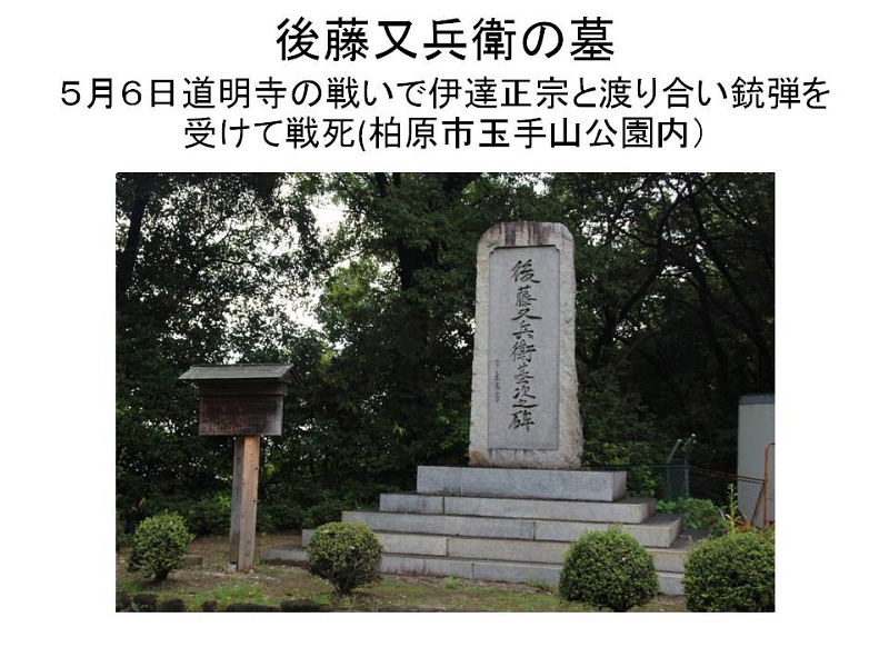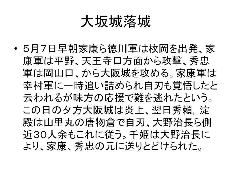 | 大坂夏の陣の勃発 和議の条件として、徳川家康、秀忠から豊臣氏に、次の5カ条の誓紙が出された。 1大坂城に篭城した浪人達の罪は問わない。 2秀頼の知行は、以前のとおりとする。 3淀君(秀頼の母)は、江戸に下る必要はない。 4秀頼が大坂を立ち退くというなら、どこへ行こうと望みしだいである。 5家康、秀忠は、秀頼に対して、いささかも不信行為はしない。 そして、和議の条件として、大坂城の外堀と内堀は埋め立てられ、二の丸と三の丸も破壊されて、大坂城は本丸だけの「はだか城」とされた。しかし、和議は、豊臣氏に味方した、立身出世や仕官を望む浪人達にとっては失業を意味した。このため、大坂城内では、しだいに再戦を望む声が高まって行き、埋め立てられた堀の復旧工事などが開始された。 これを知った家康は、先の誓紙をひるがえし、豊臣氏に対して、「城中の浪人をすべて追放するか、豊臣氏は大坂城を出て伊勢か大和へ移れ」との要求をつきつけた。 ここに至って豊臣氏の怒りは爆発、ついに再戦が決せられた。夏の陣の勃発である。しかし、本丸だけの「はだか城」では、冬の陣のときのように篭城戦法に頼るわけにはいかない。そこで、豊臣氏は、徳川氏に野戦を挑むこととした。 大坂夏の陣の戦闘経過 夏の陣の主戦場は、河内であった。豊臣方約5万、徳川方約15万5千といわれる。 慶長20年(1615)4月28日、豊臣方の大野治房ら、泉南の樫井で徳川方の浅野長晟らと合戦。豊臣方の塙団右衛門、討ち死に。豊臣方は、治房の報告により、徳川方が、河内街道からだけでなく奈良街道からも進撃して来ることを知る。 5月1日、豊臣方の後藤基次、薄田兼相ら平野に出陣。真田幸村ら天王寺に布陣。 5月5日、家康、京を進発。秀忠、伏見を進発。徳川方の先陣・藤堂高虎、河内千塚に布陣。井伊直孝、楽音寺に布陣。水野勝成、河内国分に布陣。徳川方の本多忠政、松平忠明、伊達政宗らの諸隊も河内に到着。伊達隊の先鋒・片倉重綱、片山に布陣。 5月6日、後藤基次、小松山で徳川方の諸隊と激突して、討ち死に。小松山の戦い。薄田兼相、道明寺河原の戦いで討ち死に。豊臣方の残兵、藤井寺・誉田森へ退却。豊臣方の木村重成、佐久間忠頼らの諸将、八尾・若江で相次いで討ち死に。豊臣方の真田幸村、毛利勝久ら大坂城に退却。 5月7日、真田幸村、家康の本陣に突入して討ち死に。徳川方も本多忠朝、小笠原秀政ら討ち死に。 5月8日、大坂城落城。秀頼、淀君らは自害。豊臣氏、滅亡。一説によると、毛利勝永が秀頼の介錯をつとめ、その後に自害したという。 5月8日、天晴 巳刻に至り大坂城落つ、秀頼公、同御袋、そのほか女中20人ばかり自害の由也、打ち死にの衆2万ばかりの由也、(中略) その夜、もってのほか雨降る。(梵舜日記) 両軍の作戦 徳川方は、紀伊方面からの部隊のほか、本隊と別働隊の2隊に分かれて大坂城を目指した。家康、秀忠以下約12万の本隊は生駒山麓西側の高野街道を進む河内路を、伊達政宗ら約3万5千の別働隊は奈良・法隆寺方面から河内に入る大和路をとった。 道明寺方面で合流し、その後に平野、住吉方面から大坂城に攻め上ろうとの作戦である。 これを知った豊臣方では、徳川方が合流する前に機先を制して各個撃破する、との方針を立てた。木村長門守重成(約4千7百)と長宗我部宮内少輔盛親(約5千)が高野街道を南下する徳川方本隊を八尾・若江で側面から攻撃し、後藤又兵衛基次(約2千8百)、薄田隼人正兼相(約4百)、真田左衛門尉幸村(約3千)、毛利勝永(約3千)らは、国分の狭路を通って河内に入って来ようとする別働隊を迎え撃とうというのである。 大坂城に守備兵力のほか約1万の予備兵力を配置し、八尾、国分、紀伊の3方面で徳川方を迎え撃つ。勝機のつかめそうな方面に予備兵力を投入して徳川方に打撃を与え、兵力差をできるだけ縮めて後、全兵力を大坂城に戻して態勢を整え最終決戦にのぞむ、というのが、豊臣方の戦略であった。 しかし、豊臣方の動きは、忍者からの報告などにより徳川方に筒抜けであったのに対し、豊臣方では今ひとつ情報収集力に欠けるところがあった。そのうえ、諸隊の動きが統一性を欠くなど、いくつかの問題点をかかえていた。 小松山の戦い(国分・道明寺の戦い) 5月1日、後藤又兵衛基次、薄田隼人正兼相ら平野に到着。真田幸村、毛利勝永ら天王寺に布陣。 5月5日、幸村らは、基次と会合、6日を期して道明寺で合流し、国分において徳川方を迎え撃つことを約した。 同日夜、基次は、約2千8百の軍勢を率いて平野を進発。奈良街道を東進し、6日未明、藤井寺に到着した。しかし、濃霧のため、他の諸隊は、予定どおり到着できなかった。しかも、基次ら豊臣方の動きは、すでに徳川方の知るところであったという。 このため、基次は単独で道明寺に進出したが、このときすでに徳川方は国分に入ってしまっていた。そこで、基次は、後続の諸隊を待つことなく、先鋒の山田外記、古沢満興に命じて、石川を渡り、当