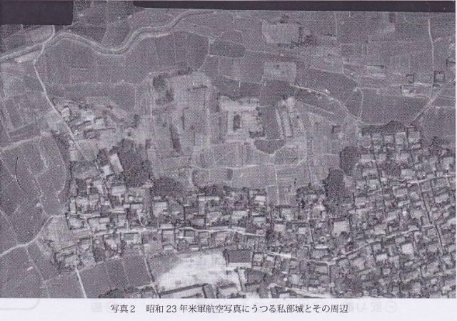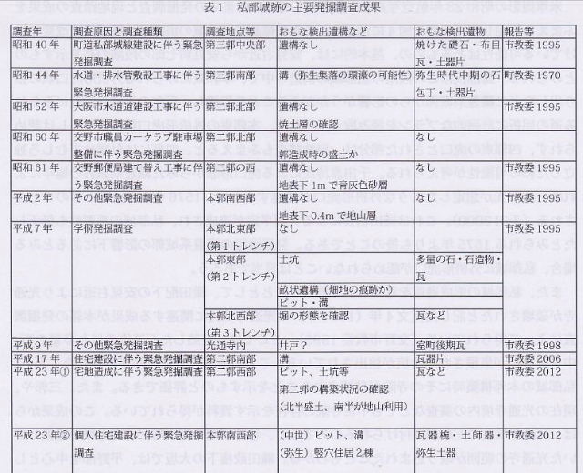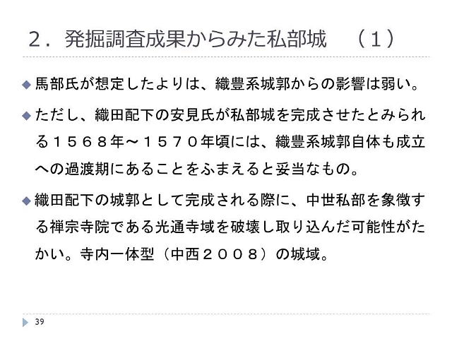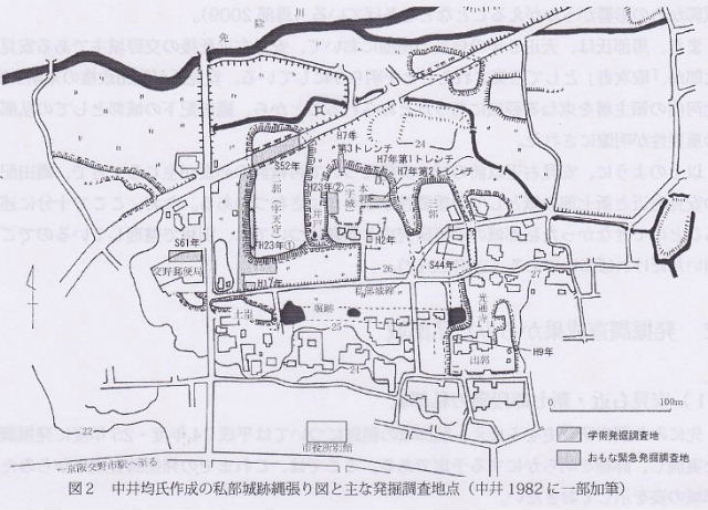 | はじめに 私部城(交野城)は、大阪府の北東部、交野市の私部に位置する平城である。私部城という呼称は、江戸時代の河内名所図会に記されており、現在も地元で定着し、市の遺跡名になっている。戦国期の史料では、「交野城」として記されており、文献史研究や城郭研究においてはこの呼称の方が一般的になっている。現在も私部には、本郭をはじめとして戦国期の「土の城」の姿が断片的ながらも維持されている。平城の多くがその姿を消した大阪府内で、現在も戦国期の平城跡を地上で確認できるのは、私部城以外では本丸が陵墓とされたことにより維持されている高屋城のみであり、この遺存状況は奇跡的とも評価されている。 また、単に残りが良いだけではなく、大阪府内の戦国期を考える上でも重要な城郭である。北河内は三好氏の強い影響下にあり、山城が割拠した地域である。それに対して私部城は、河内国守護であった畠山氏配下の安見氏によって築かれた反三好の平城として評価されてきた(中井1982ほか)。府内でめずらしい複数の郭を並列させる連郭式(群郭・列郭)の構造をとることから、異色の中世城郭とされる。近年も進展しつつある調査研究史の整理と、発掘成果をふまえて、私部城の歴史を追ってみよう。 ![]() T 調査研究史 (1)郷土史家の研究から城郭研究へ 北河内の郷土史家の研究によるところが大きい。平尾兵吾氏は、『北河内史蹟史話』で畠山氏配下の安見氏が築いた城とし、『信長公記』にもとづき、高屋城・若江城に次いで、織田配下の反三好の城として記されていることを紹介している。片山長三氏は『交野町史』において、『安見家系譜』などの地域に残る文書をもとに、南北朝期に安見氏が私部城を築き、畠山氏配下として活躍したとしている。また、私部城築城以前の居館の可能性がある場として、私部の南部に位置するでがしろ遺跡をあげている(片山1981)。 日本城郭体系では中井氏作成の縄張り図が掲載され、本郭から三郭を取り囲む土塁や堀の跡など、これまで知られていなかった城の構造が明らかにされた(田代ほか編1981)。また中井均氏は大坂・京都・奈良を結ぶ街道の近隣に位置する戦国期の要衝に位置することを指摘している(中井1982)。中西裕樹氏は、安見宗房段階の城として公的性格を備えていた可能性を指摘した(中西2004)。こうした研究において、私部城は、畠山氏配下の安見氏の城郭として注目されてきた。 (2)安見氏研究から明らかにされた織田配下の城としての重要性 小谷利明氏や弓倉弘年氏らにより、戦国期畿内の守護の研究が進められる中で、安見氏の実態も明らかにされた(小谷2003、弓倉2006)。私部城を考える上で重要だったのは、軍記にあらわれる「安見直政」の記述から混同されることの多かった河内国上郡代「安見宗房」と、文献で確認できる最初の交野城主「安見右近」が別人物であることが判明したことだった。 ![]() 馬部氏は、この成果に加えて戦国期前後の私部の様相を整理したうえで、私部城が織田配下となった安見右近により築かれたものであり、それ以前の安見氏が私部に居城を構えていた可能性が低いとしている。その根拠として、@戦国期以前の私部城築城の根拠であった『安見家系譜』が偽文書であること、A安見右近の交野城が確認される以前の私部では有力な禅宗寺院であった光通寺が全盛期にあることが知られる一方で、安見氏の居城に関する記録が確認できないこと、B織田配下となる以前の安見右近がむしろ交野の星田に拠点を置いているとみられること、C昭和29年の航空写真から私部城の形態に織豊系城郭からの影響がうかがえることなどをあげている(馬部2009)。 また、馬部氏は、天正9年の信長の馬揃において、安見右近死後の交野城主である安見新七郎が、「取次者」として召集されたことを明らかにしている。安見氏が織田政権の末期まで、北河内の領主層を束ねる要職にあったとみられることから、織田配下の城郭としての私部城の重要性が明瞭にされた。 以上のように、安見右近以前の城の実態について再検討の必要が生じる一方で、織田配下の安見右近と新七郎の城としての重要性が明らかにされつつある。なお、ここで十分に述べることのできなかった私部城の調査研究史と課題については、別稿で整理しているのでご参照いただければ幸いである(吉田2012)。 ![]() ![]() 2 発掘調査成果からみた私部城 (1)安見右近・新七郎段階の私部城 先にみた調査研究史をふまえ、私部城の範囲については平成24年度・25年度に発掘調査を実施し、詳細を明らかにする予定である。ここでは、これまでの発掘調査成果からみた私部城の姿を示しておきたい。 米軍撮影の昭和23年航空写真を下敷きにして、これまでの発掘調査と現地踏査の成果をふまえて推定した城の姿を図4に示した。ここで確認される城の痕跡は、廃城時に改変を受けている可能性はあるものの、基本的には、安見右近から安見新七郎の段階の姿を示すものとみ