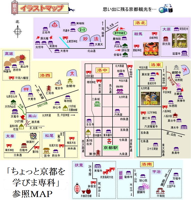 | @京都の地名の変遷 「山代」から「山背」そして「山城」に。 A「京都」の地名はどうしてついたか? 桓武天皇の長岡京遷都以来、「京」は一つという考え方が定着。それまではどうであったか。複数の京が存在した。聖武天皇を例に挙げると一度に三ヶ所も京が存在。しかし天皇がお住まいになられる「皇都」は一つしかなく、平安京遷都にも受け継がれた。即ち京都とは、「京の都」という同義語の重ね言葉になり、11世紀後半頃、固有名詞として地名になったと言われている。 @歴史 平安時代を通じて京中には、国営寺院である東寺、西寺以外に寺院の建立は認められなかった。但し、町堂的なものなどは黙認されていた。 - 鎌倉時代、特に室町時代に入ってからは、時宗、浄土宗、一向宗(浄土真宗)、禅宗、法華宗などの新仏教が京中に拠点をつくり始めた。 A「永観堂」のように「堂」がつく寺は殆どが通称名。 ・真如堂(真正極楽寺) ・六角堂(頂法寺) ・革堂(行願寺) ・三十三間堂(蓮華王院) ・千本ゑんま堂(引接寺) ・千本釈迦堂(大報恩寺) ・嵯峨釈迦堂(清涼寺)など B年号が寺名になっている寺。 ・延暦寺(延暦4年) ・仁和寺(仁和4年) ・建仁寺(建仁2年) C「中風まじない」の寺 ・安楽寺の鹿ヶ谷かぼちや供養 ・千本釈迦堂、了徳寺の大根(だいこ)炊き D冥界への入り口があるといわれている寺。 六道珍皇寺門前の辺りを「六道の辻」という。この地が葬地である「鳥辺野」の入り口にあたる。 ここの撞く鐘は「迎え鐘」と呼び、精霊を冥界から呼び戻すという。 ※風葬の地 「東の鳥辺野」 「西の化野」 「北の蓮台野」 E京の七不思議の一つ、浄土宗総本山知恩院の七不思議。 忘れ傘、抜け雀、白木の棺、三方正面真向きの猫等など。 しかし番外が? F泉涌寺は「御寺(みてら)」と呼ばれ、全国で唯一皇室の菩提寺 G平安時代の貴族の山荘・別荘が寺に変身。 ・宇治平等院 → 藤原道長の別荘(宇治殿) ・日野法界寺 → 日野資業(すけなり)の山荘 ・即成就院(泉涌寺塔頭) → 橘俊綱の山荘(伏見山荘) H鎌倉初期に二度の入宋を果たした栄西が伝えた「臨済宗」。当時8寺の大本山があった (現在万寿寺は廃寺で7寺)。それぞれが禅風を持っており、 これの代名詞というべきものが「禅面(づら)」である。 ・学問面(建仁寺) ・声明面(相国寺) ・武家面(南禅寺) ・茶面(大徳寺) ・伽藍面(東福寺) ・算盤面(妙心寺) ※京都五山とは 京都にある禅宗の五大官寺。(1)天竜寺、(2)相国寺、(3)建仁寺、(4)東福寺、(5)万寿寺の5か寺。 時期により該当する寺院や位次に変更がある。また五山の上位として南禅寺が置かれた I京都市内には五重塔が4塔しかない、国宝が2塔、重文が2塔。 ※京都府内にはもう1塔の国宝の五重塔が。 因みに市内には三重塔は3塔のみ。 @伏見稲荷大社 ・狐は祭神か 「稲荷」とは本来五穀をつかさどる神である。即ち「農業の神」であり、穀物を食べる野ネズミを狐が 食べてくれるので、狐を穀物の守り神と考え、そこから結びついた説が有力。 ※伏見人形 ・伏見人形のお店は「丹嘉」一軒だけ。「伏見人形面ばかり」とは? A狛犬ならぬ他の生き物の神社を紹介。 ・「狛猪」 → 護王神社 ・「狛兎」→ 岡崎神社 ・「狛龍」→伏見神賓(ふしみかんだから)神社 ・「狛鳩」 → 三宅八幡神社 ・「狛鼠」 → 大豊神社 B寺社ゆかりの菓子 ・下鴨神社の加茂みたらし団子 ・上賀茂神社の神馬堂の焼き餅 ・北野天満宮の長五郎餅 ・御霊神社の唐板 ・今宮神社のあぶり餅 ・伏見稲荷神社のきつね煎餅 ・石清水八植宮の走り餅など ※下鴨神社参道に「さるや」が開業、140年ぶりに復活した「申餅(さるもち)」 C珍しいお寺を紹介。 ・御髪(みかみ)神社 日本で唯一「髪」をお守りする神社。元々理容関孫の人々が信仰していたが、いつの間にか薄毛の人も 多数お参りするようになったとの事。 ・御金(みかね)神社 金色の鳥居など黄金色に飾られた神社で、お金を祭る神社として、資産運用や証券取引等の成功を 願ったり、競馬競輪などでの勝利や、宝くじ等の当選を願う絵馬が大量に奉納されている。 Dその他 神社仏閣の数は京都府は全国で何番目。 (1)祭 @三大祭(葵祭・祇園祭・時代祭) ・葵祭 賀茂別雷神社と賀茂御租神社の例祭。5月15日勅使を中心とした本列と斎王代を中心とした 女人列が御所を出発。 ・祇園祭 古くは祗園御霊会と呼び八坂神社の例祭。7月17日の山鉾巡行が大きく取り上げられているが、 実は1ヶ月に及ぶいろんな行事や祭儀をまとめて祗園祭と呼ぶ。また、1965年までは、前祭 (さきのまつり)と後祭(あとのまつり)があった。 ・時代祭 京都の誕生祭として10月22日に行われる、幕末維新から平安創業までの時代風俗行列である。 2007年より室町時代列が新たに加わった。 A三大奇祭 ・今宮神社のやすさい祭 ・鞍馬寺の火祭 ・広隆寺の牛祭(現在中止) (2)主な行事 @五山の送り火 A曲水の宴 B三船祭 @南禅寺の三門から石川五右衛門は「絶景かな」と言った? ・五右衛門は実在人物。でも‥・ A牛若丸と弁慶が出会ったのは五条