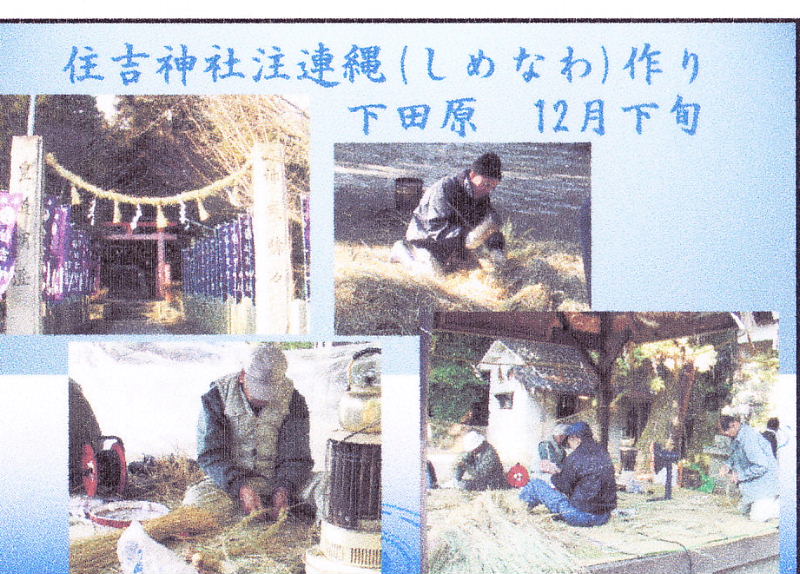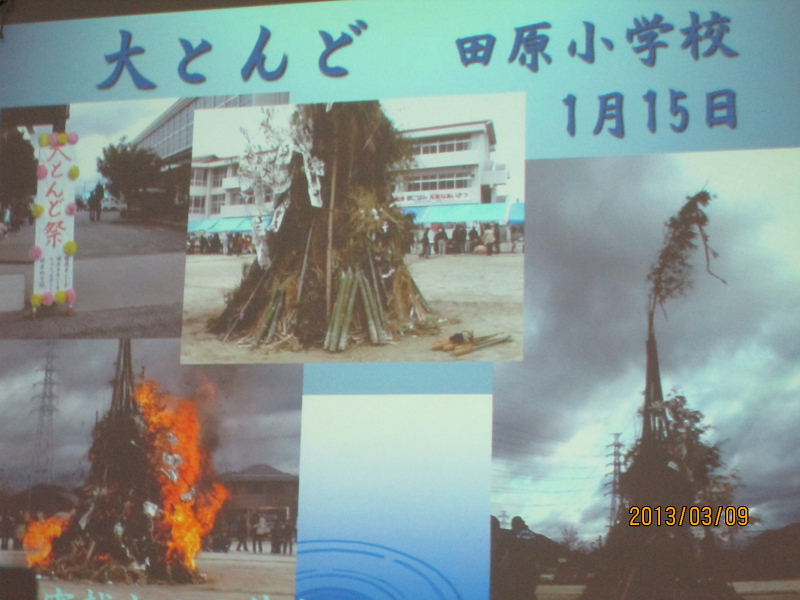 | 上田原、下田原では子供は1月6日の夕方に紙とんどを、大人は1月15日の早朝に大とんどをしてきた。場所はいずれも垣内(かいと=今のとなり組)に近い川べりのとんど場で行った。 〔子供たちの紙とんど〕 1月6日は、冬体み中だったので、子供たちだけで行った。垣内の最年長の子供(小学校6年生か高等科2年生)が指揮を取り、役割を決める。朝8時ごろから青竹10数本、わら10束(そく)ぐらいと、しめ縄などを2~ 3人がチームとなってもらいにまわり、竹の上にのせて引っ張ってとんど場に集まる。子供たちの人数に合ったとんどの大きさを決め、午後には力を合わせてとんど作りをする。 太い竹を芯にしてわらをまく。まわりに細い竹をつけて、藤つるでしめる.直径lmぐらぃ、高さ5~6mのとんどができる。立ち上げるのが大変だった。上級生が下にもぐり込んで肩を入れる。下級生はつっぱりの竹を持ってまわりから支える。息を合わせての共同作業である。何回もやり直す。夕方になって立ち上がった頃、おばあさんたちが孫の手を引いてもちと書初めをもつて集まってくる。 「みんな、ようやったな。今年のとんどはおっきいわ」とほめてくれる。上級生に怒られたり励まされたりして、しんどかった事がいっペんにふっとんで、自分ひとりで立てたような満足感がわく。 暗くなりかけた頃に点火である。みんなが見守る中、おおやけに認められたマッチでの点火は最上級生の役目だつた。パチバチ、パーンと青竹の爆(は)ぜる音に励まされ、火の粉の中、熱いのをがまんして真っ赤な顔になつて勇気を出してとんどを倒さないように「ささえ竹」をにぎって持ち場を死守する気持ちでがんばる。八分どおり燃えおちたころ「たおすぞぉ―」の一声で決めておいた方のささえ竹を外してたおす。火の粉が舞い上がり壮観であった。 ![]() 後はみんなかいがいしくまめに働く。真っ赤な火を引き出してもちを焼く。ふくれたもち、黒こげのもちをかじる子供たちは幸せそのもののようだった。火のついた竹を持って帰り、神棚に灯りをそなえ、寒の入りのあぶらあげごはんを食べて大寒に向けての健康づくりをする。 1月6日の紙とんどは大人のさしずはひとつももらわないで子供たちだけで成功させる「しんぼう、協力、助け合い」のすばらしい伝統行事であった。 開発が進み、田原台の住宅地ではとんどの条件がそろわないので、田原小学校の校庭をお借りして大人だけで大とんどの行事を行つているが、子供たちの発想で危険を伴わない大とんどを盛り上げる活動を一つでも見つけてやれない物かと思う。 〔小正月の大とんど〕 1月14日は「お日待ちJの行事が各垣内で行われた。当屋(当番)の家主が集まり、床の間に「天照皇太神」の掛け軸をかけて拝み、 1年の決算や新しい年の計画の話し合いが朝方まで続く。夜明け前に散会して、用意しておいた青竹、わら、しめ縄を持ち寄り、日の出に合わせて大とんどを燃やす。火のついた竹を持ち帰って神棚に灯りを供え、かまどに火をつけてあずきがゆを炊き、もちを入れて小正月を祝つた。 田原台が開発され、世の中の近代化が進むにつれ、村の諸行事も合理化されてきているので、村の伝統の諸行事もだんだん変わっていくものと思われる。 |