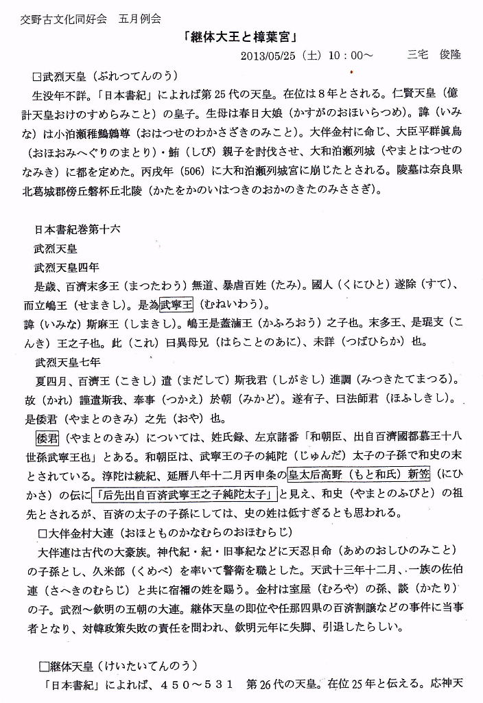 | 継体大王と樟葉宮 講演要旨 中光司会長に纏めと関係資料の解説をお願いしました。 |