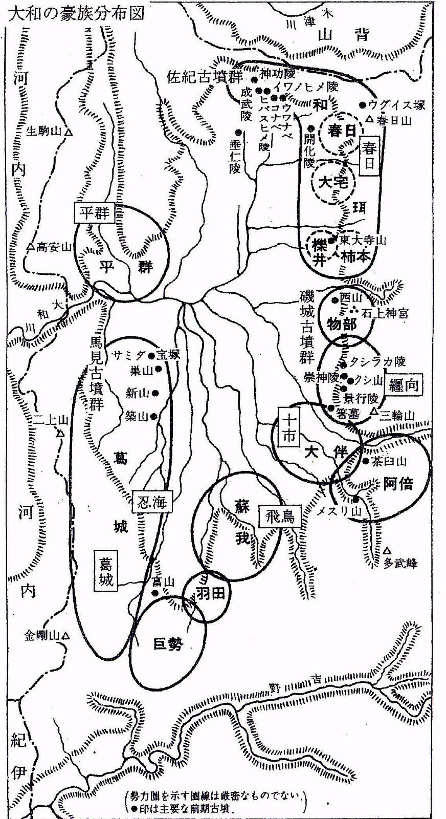 大和の豪族分布図・・大伴氏、物部氏の本貫地である奈良盆地東部と巨勢氏、 葛城氏の西・南の勢力地と天皇陵との関係をみる。飛鳥地方の蘇我氏が台頭する前の勢力地図である。 |